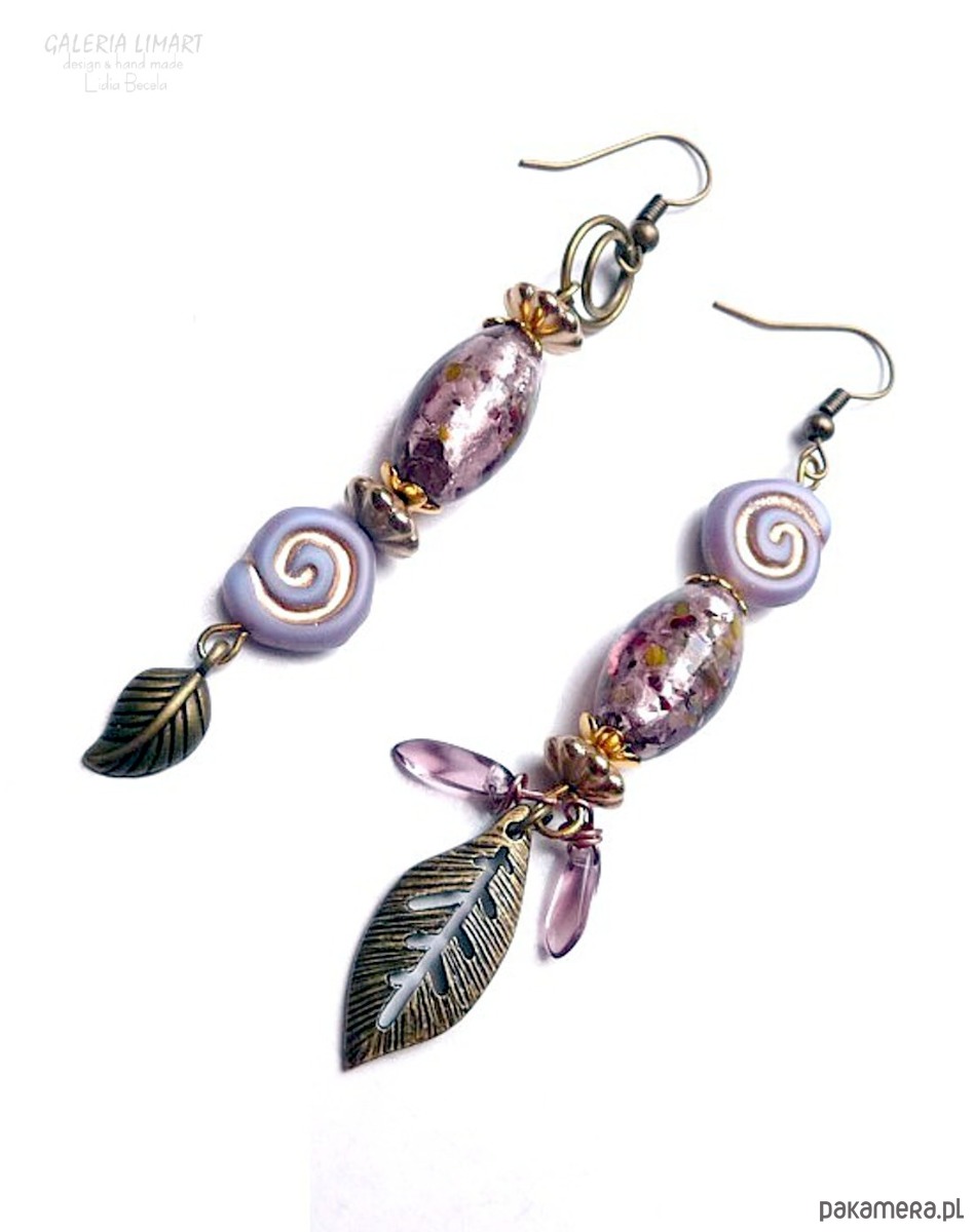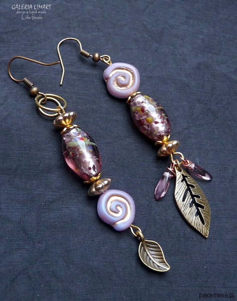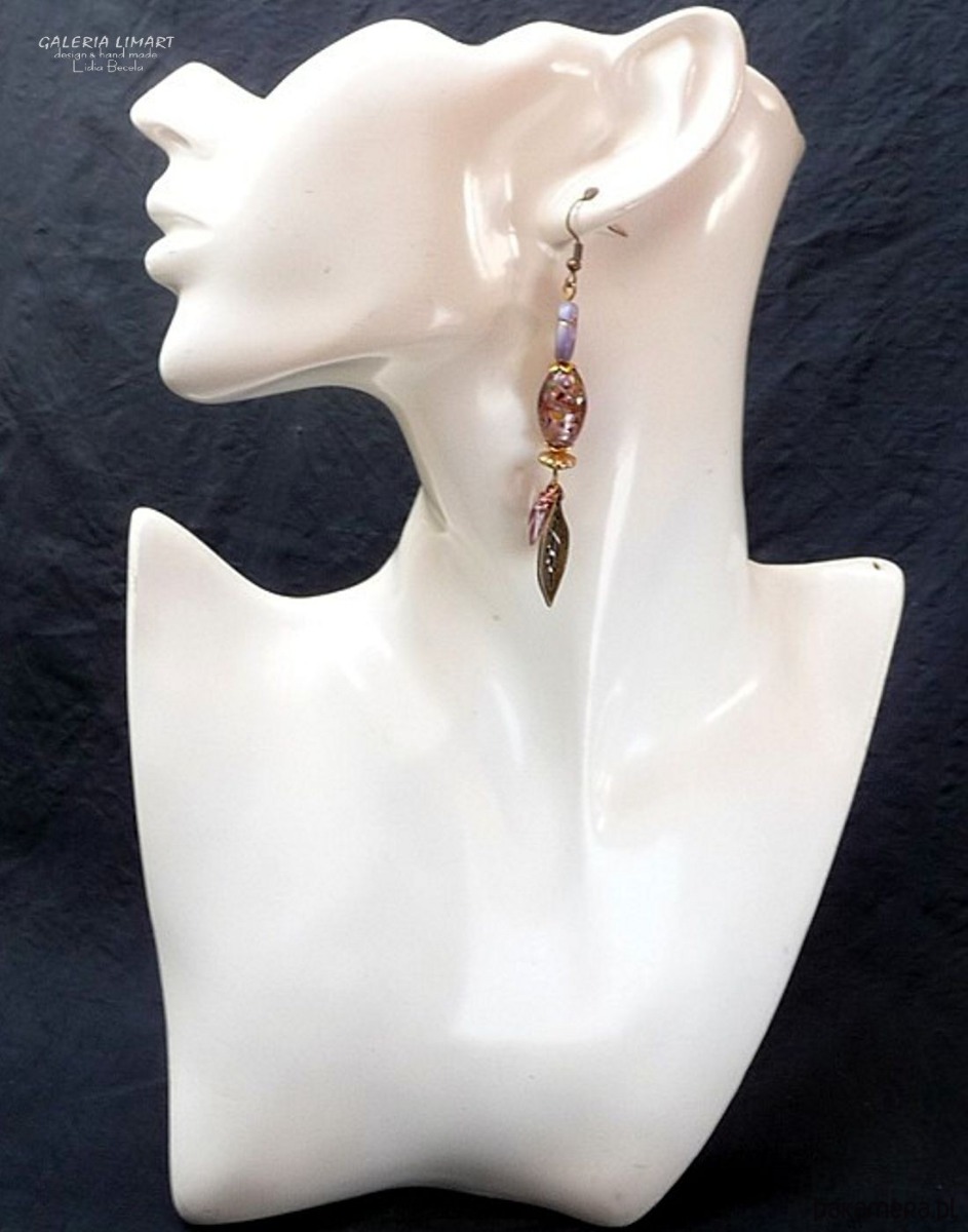 Autorskie kolczyki z pięknego szkła weneckiego w fantastycznej fioletowo-różowo-złotej tonacji. Ciekawe w swej formie dzięki zastosowaniu asymetrii. Każdy kolczyk jest inny, ale sumarycznie tworzą całość, co dało efekt niezwykły i unikatowy.