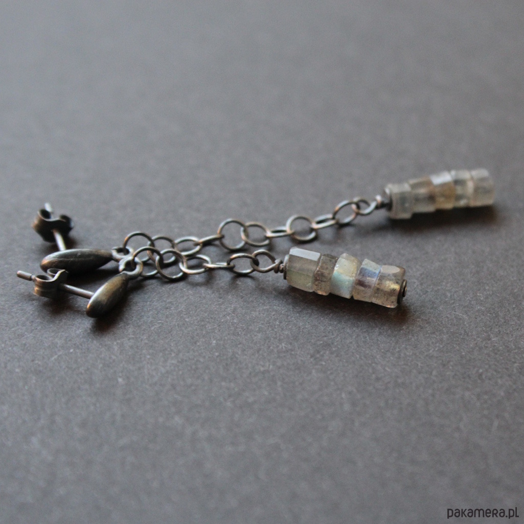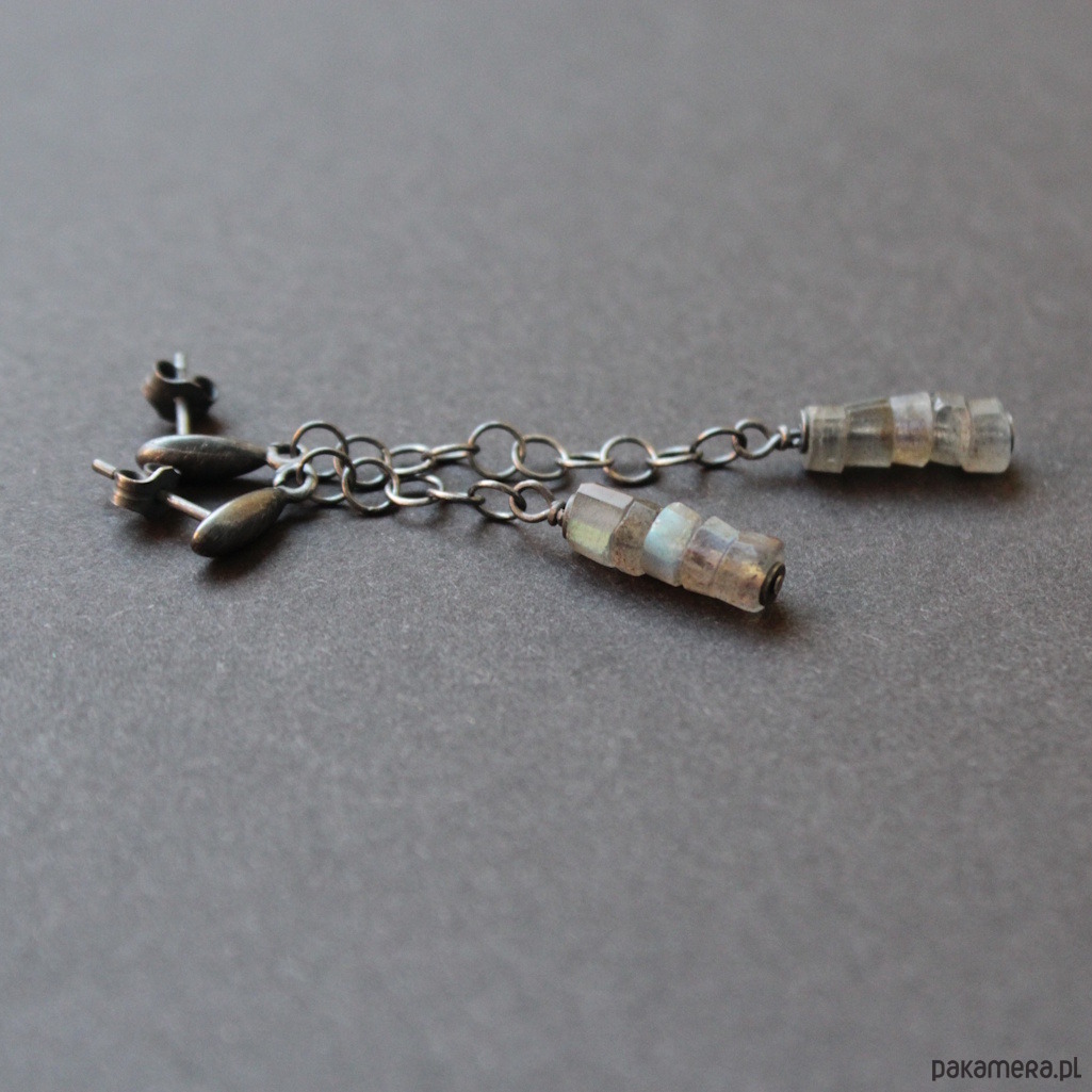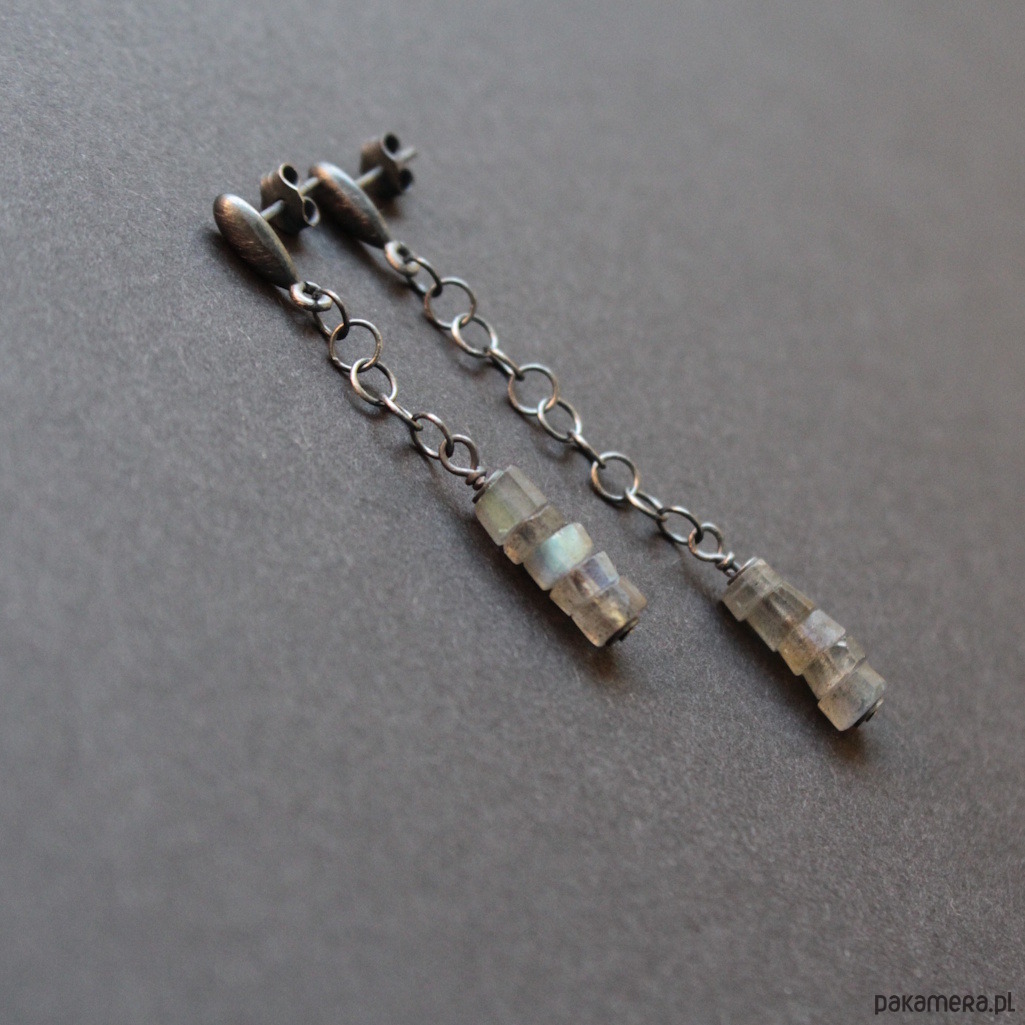 Kolczyki wykonane zostały z oksydowanego srebra próby 925 oraz pięknych plasterków labradorytów wielkości 0,3- 0,4 cm.