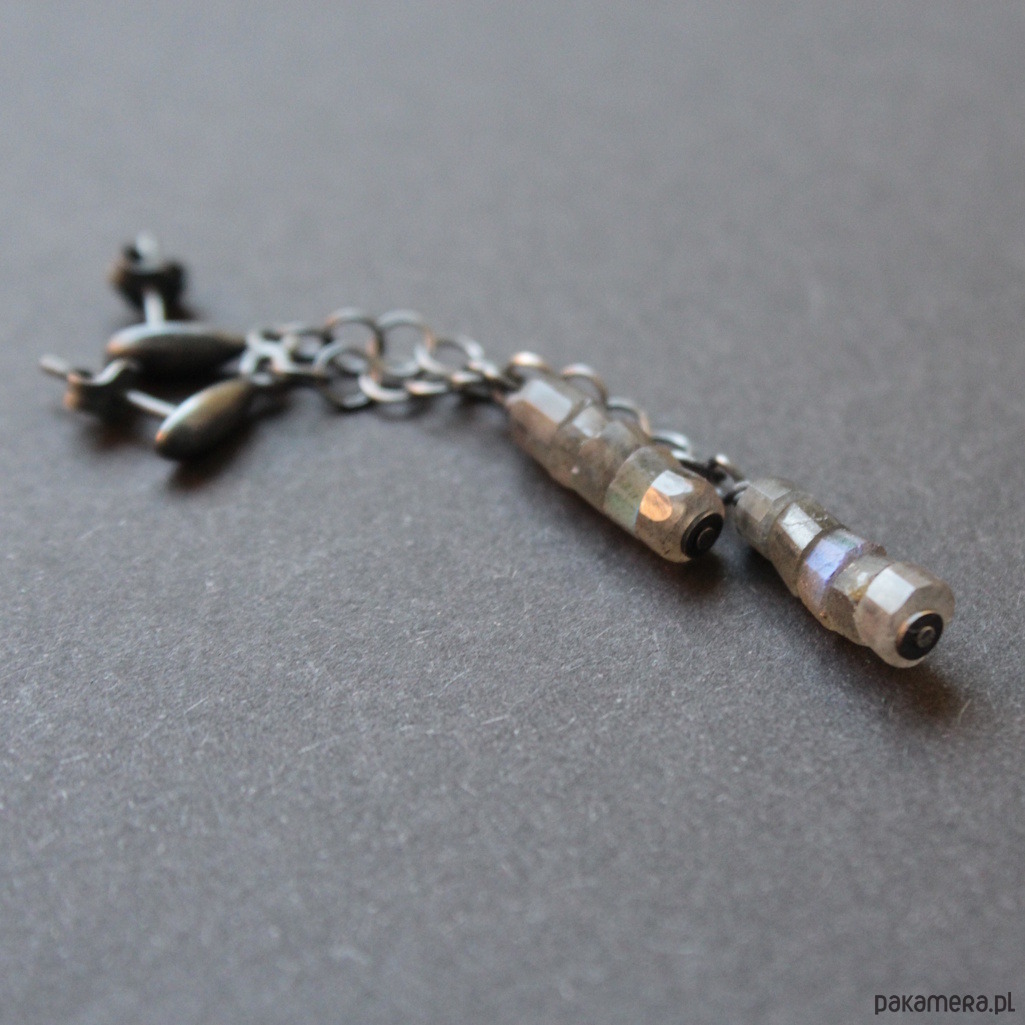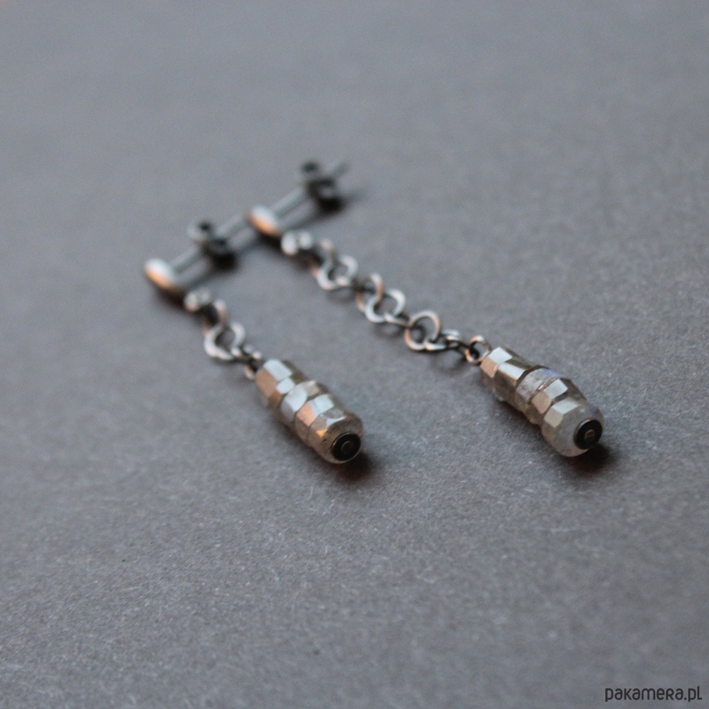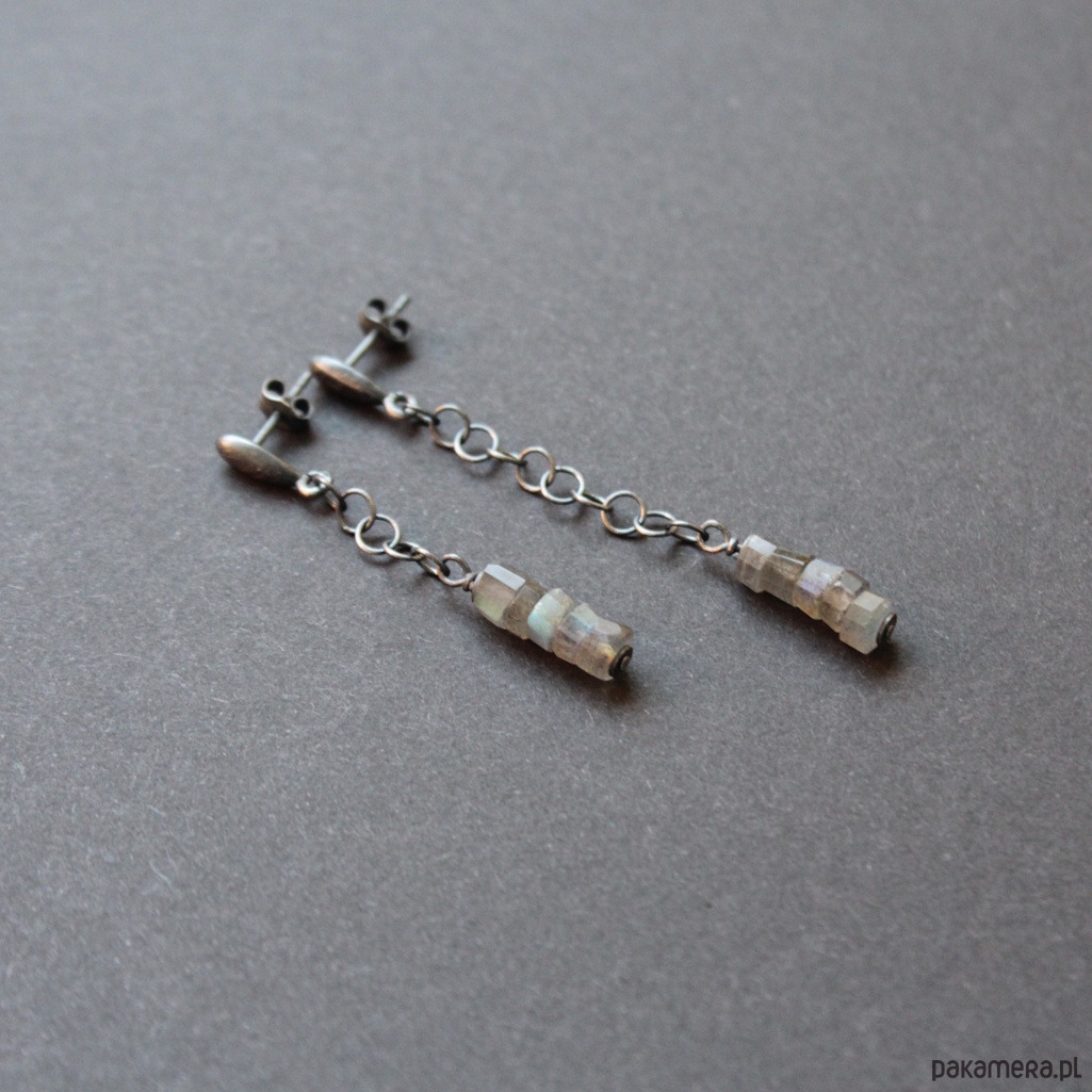 Kolczyki wykonane zostały z oksydowanego srebra próby 925 oraz pięknych plasterków labradorytów wielkości 0,3- 0,4 cm.