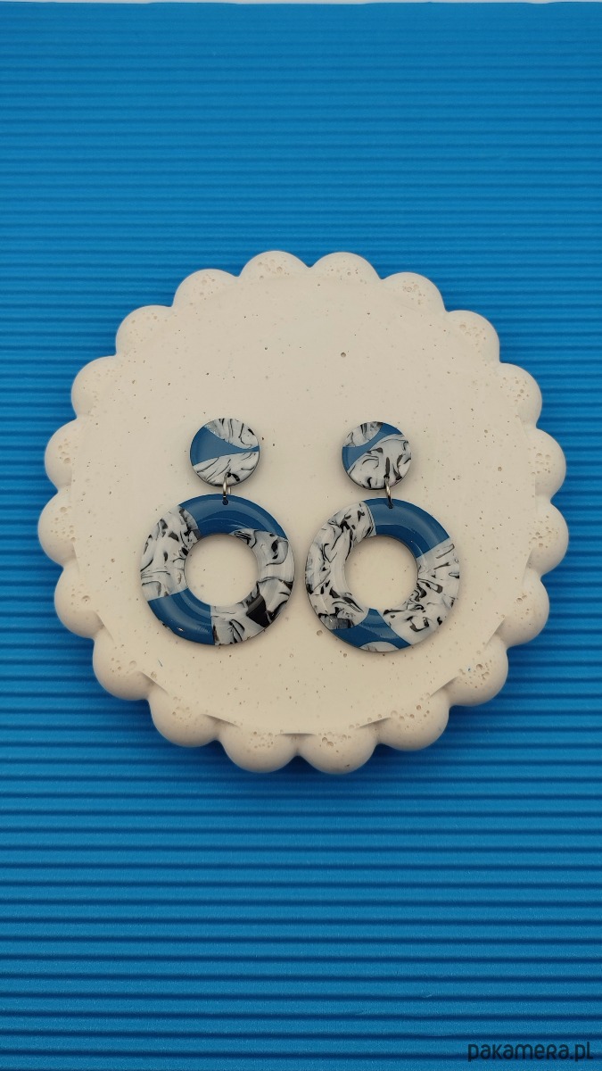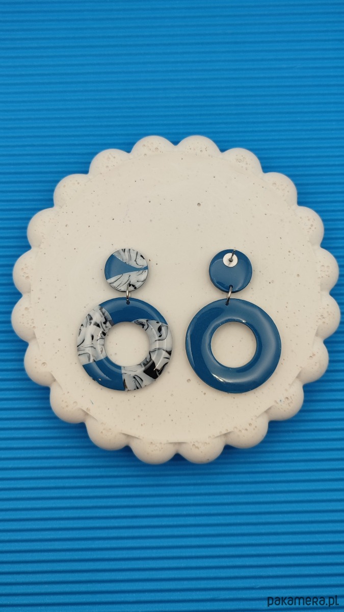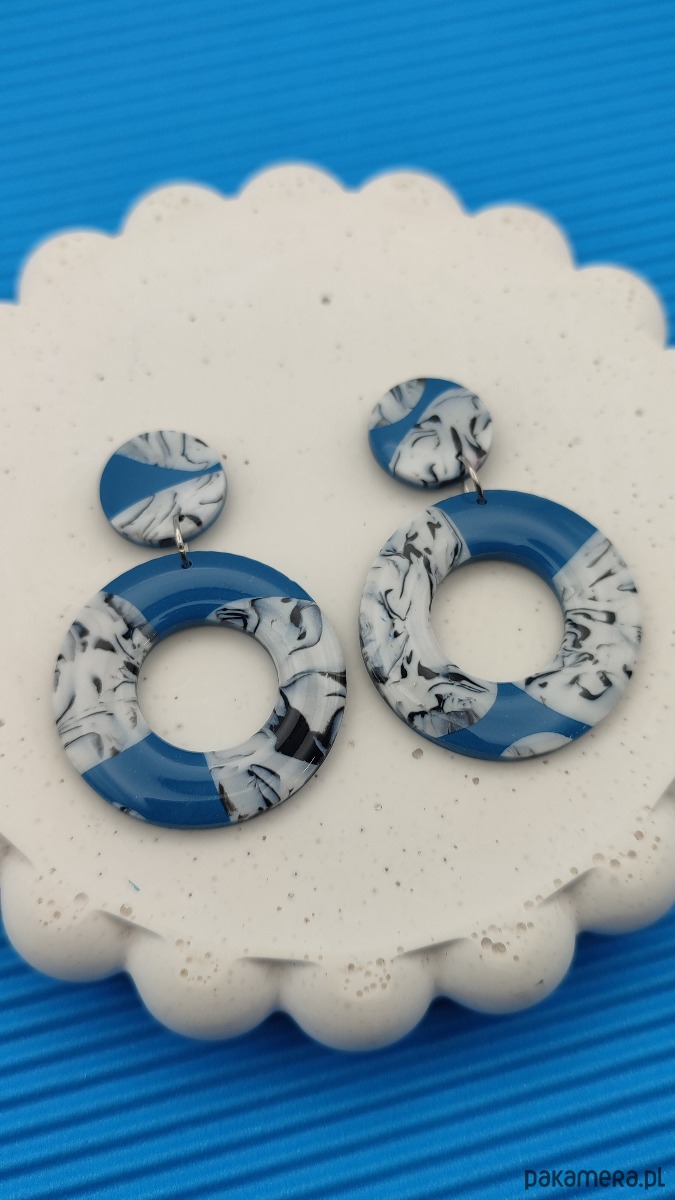 Kolczyki BALNCE - geometryczne, lekkie i przyciągające spojrzenia – kolczyki wykonane z gliny polimerowej, łączące w sobie głęboki błękit z marmurkowym wzorem w odcieniach bieli i czerni. Każdy egzemplarz tworzony jest ręcznie, dzięki czemu nie ma dwóch identycznych par – każda jest wyjątkowa.