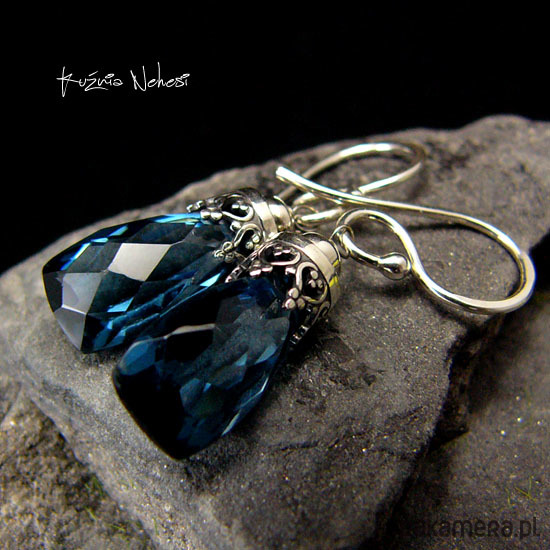 Kolczyki - Bali Bali - które pomimo swoich niewielkich rozmiarów ( 37×8,5 mm ) z pewnością przyciągną spojrzenia. Kolczyki stworzyłam w całości ze srebra które następnie oksydowałam i wypolerowałam na wysoki połysk – ten zabieg dodał im antycznego charakteru i uwidocznił koronki. Srebro próby 925 i 999 - czyste - bigle. Sercem kolczyków są dwie briolety Kwarcu w kolorze London Blue o niezwykłym szlifie. Każdy element został wykonany przeze mnie własnoręcznie z największą precyzją, kolczyki są bardzo wygodne, sama takie noszę a mam wymagające uszy. Jest to mój autorski projekt. Nehesi Design