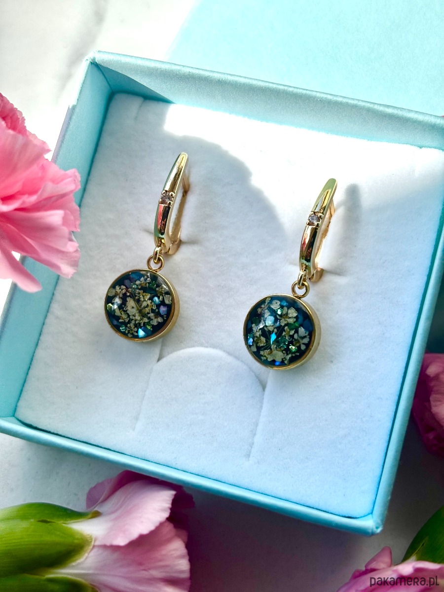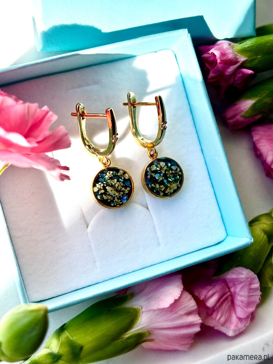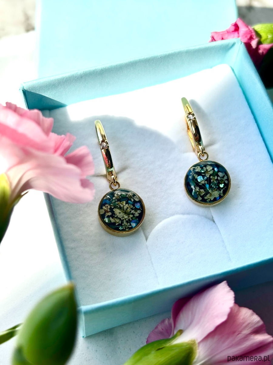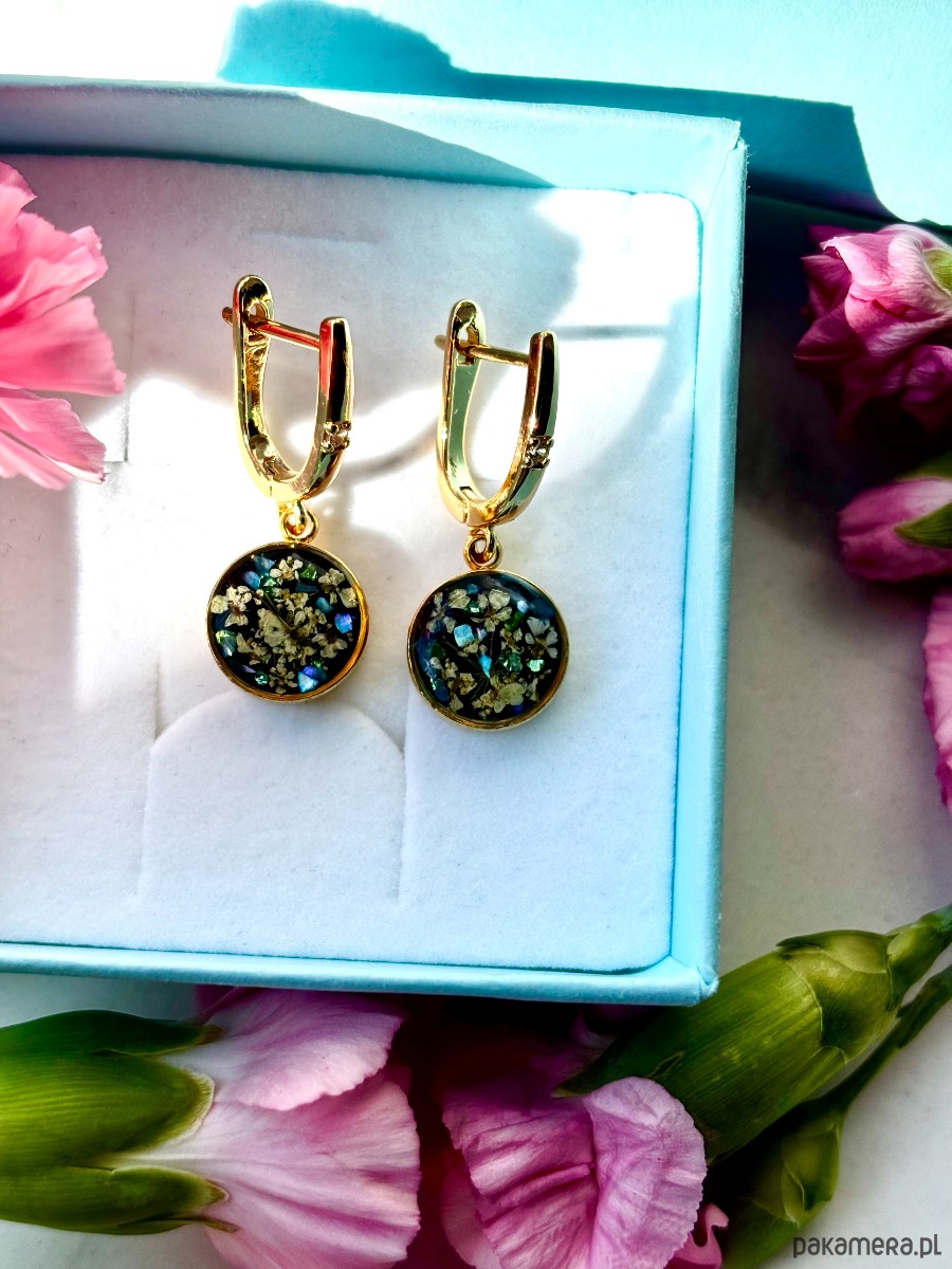Te ręcznie robione kolczyki z prawdziwymi kwiatami dzikiej marchwi w połączeniu z czarnym szkłem to kwintesencja delikatności natury i elegancji złota. Okrągłe zawieszki subtelnie poruszają się przy każdym ruchu, pięknie odbijając światło. Złocone zapięcia ze stali nierdzewnej nadają całości szlachetnego charakteru i zapewniają wygodę noszenia.