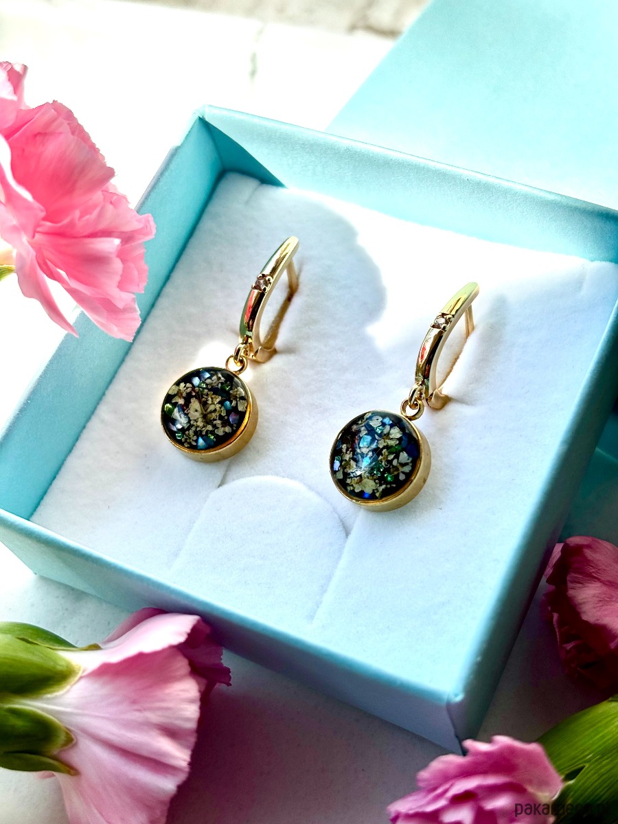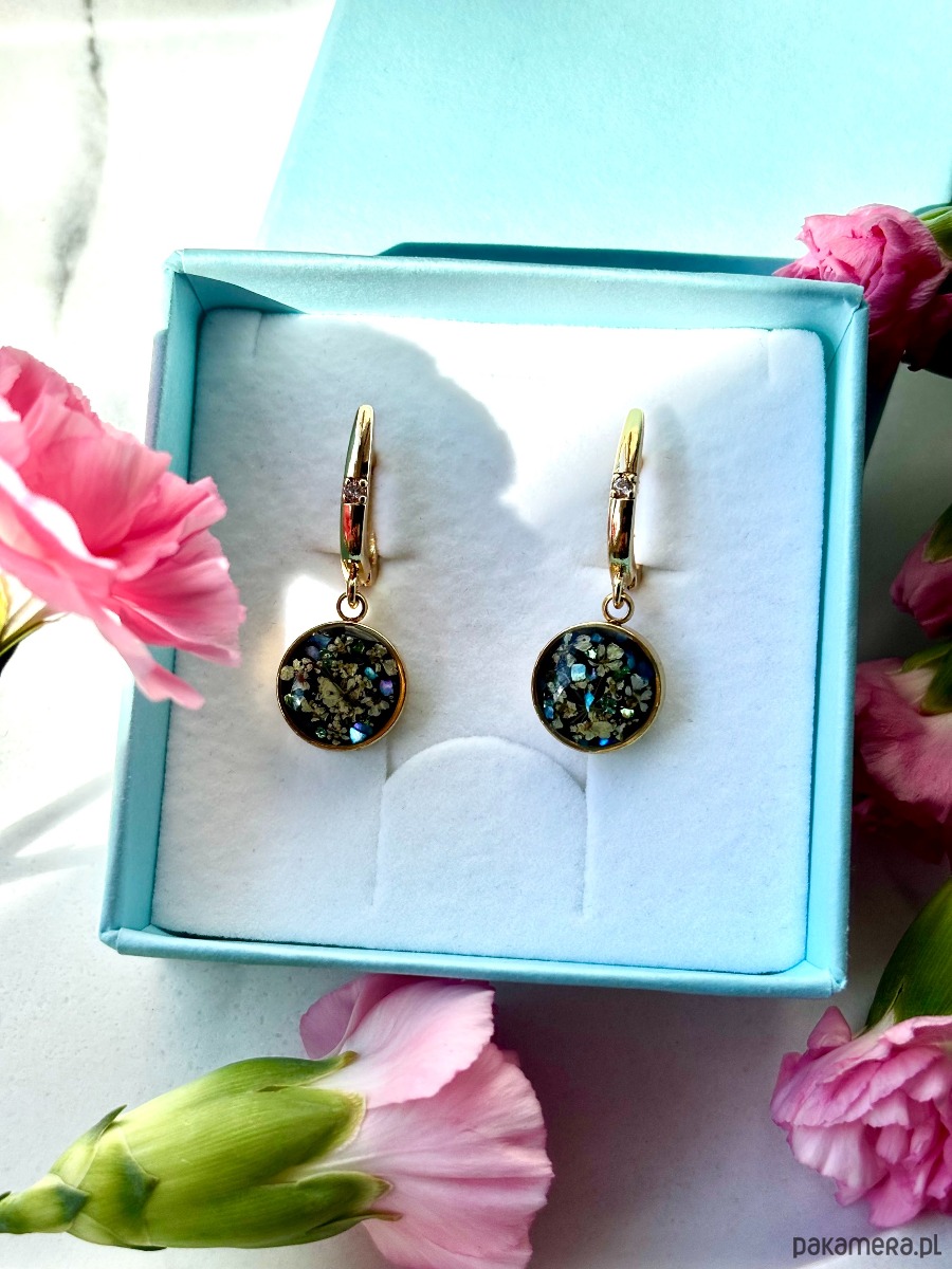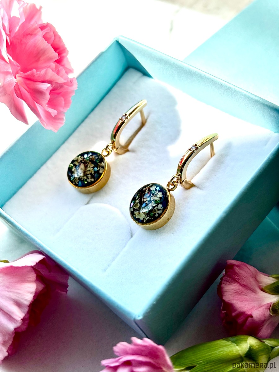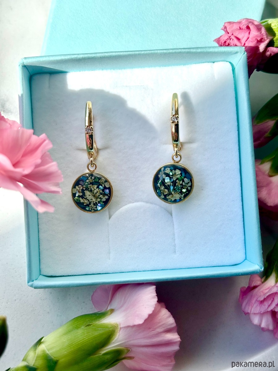 Te ręcznie robione kolczyki z prawdziwymi kwiatami dzikiej marchwi w połączeniu z czarnym szkłem to kwintesencja delikatności natury i elegancji złota. Okrągłe zawieszki subtelnie poruszają się przy każdym ruchu, pięknie odbijając światło. Złocone zapięcia ze stali nierdzewnej nadają całości szlachetnego charakteru i zapewniają wygodę noszenia.