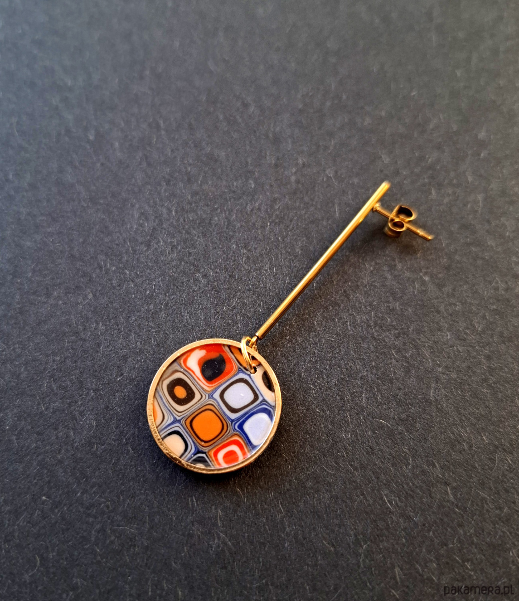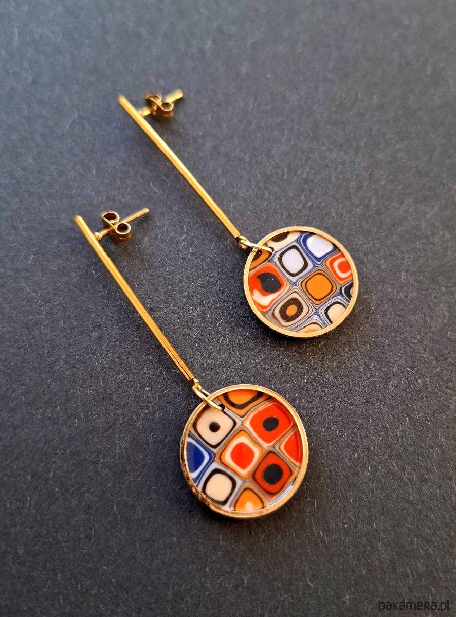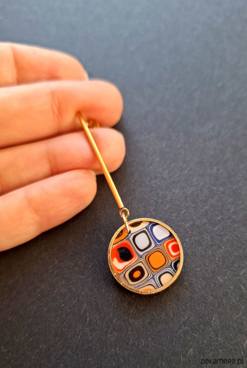Kolczyki na sztyfty wykonane z wysokiej jakości glinki polimerowej i dodatkiem ozdobnych elementów metalowych. Sztyfty proste pozłacane i nieuczulające. Kolczyki jednostronne i lekkie. Wymiary: długość całkowita - 6 cm, szerokość 2 cm. Wykonane w jedynym egzemplarzu.
