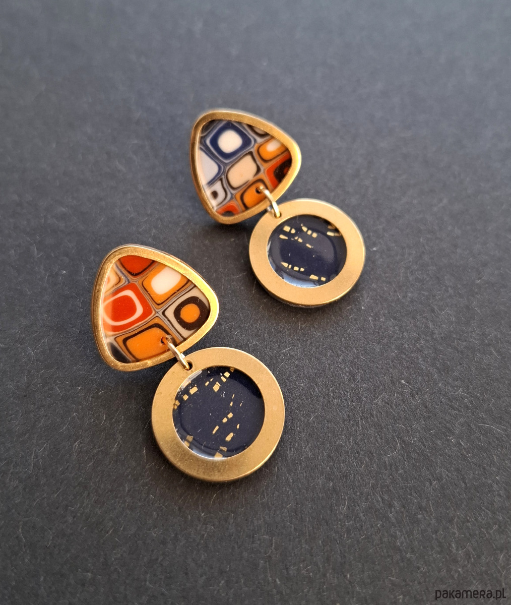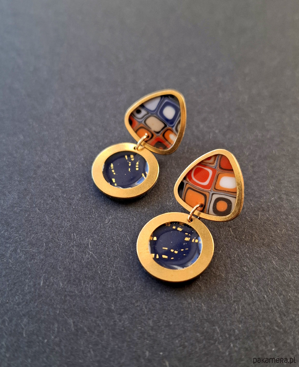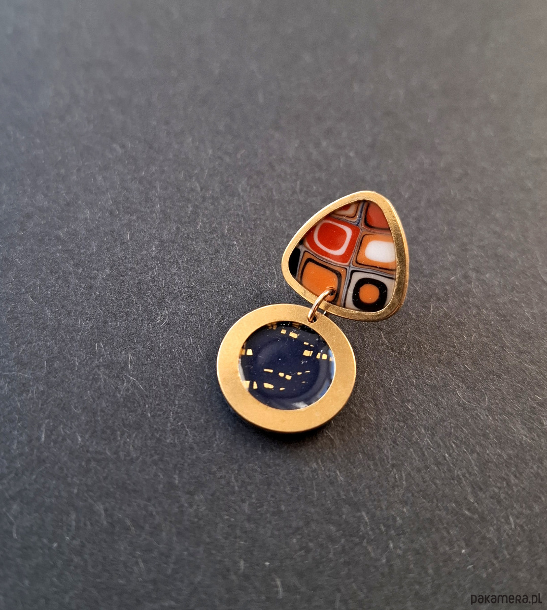 Ozdobne sztyfty wykonane z wysokiej jakości glinki polimerowej w połączeniu z ozdobnymi metalowymi elementami w złotym kolorze. Kolczyki jednostronne ze sztyftami pozłacanymi i nieuczulającymi z zapięciem na klasyczne baranki.