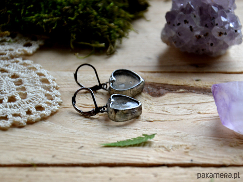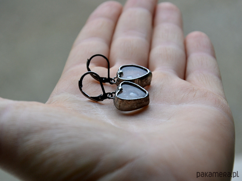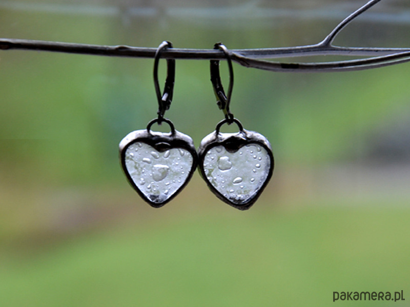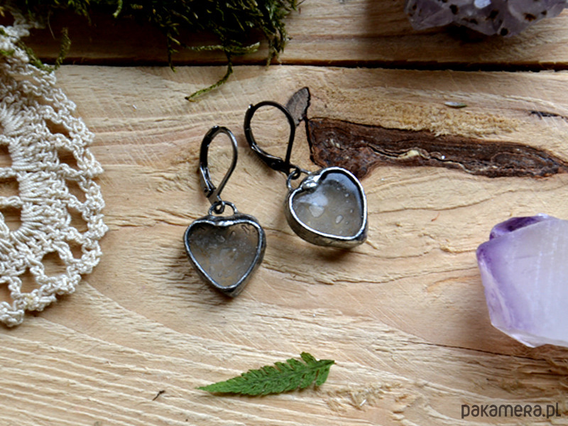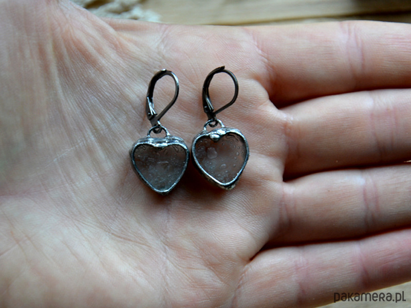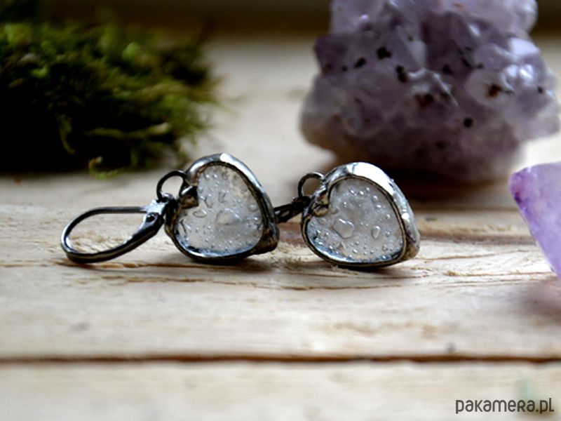 Subtelne, romantyczne, lekkie kolczyki serduszka. Szkło wypalone przez mnie, z zatopionymi białymi bąbelkami. Oprawa i bigle stylizowane na stare srebro. Długość kolczyka to ok. 3 cm. Biżuteria w 100% wykonana ręcznie, poszczególne sztuki mogą się minimalnie różnić.