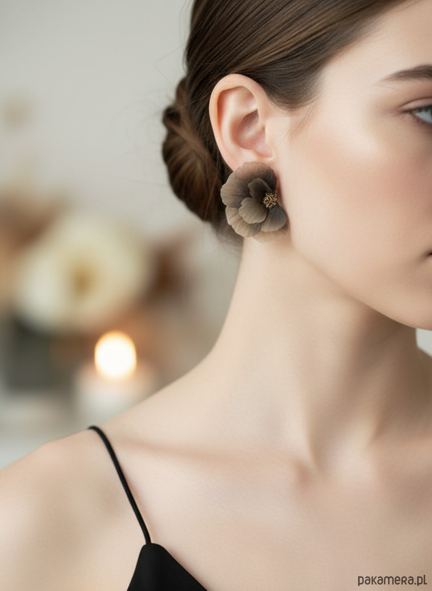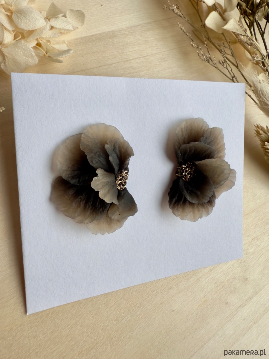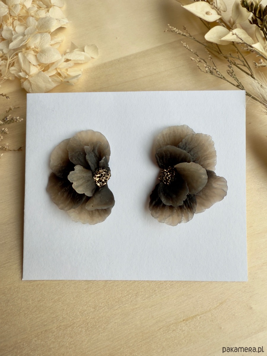 Subtelne, półprzezroczyste kolczyki w kształcie przestrzennych kwiatów, utrzymane w eleganckiej palecie czerni i beżu. Delikatne, cieniowane płatki tworzą efekt lekkiej mgiełki na uchu, a złoty środek dodaje im biżuteryjnego blasku.