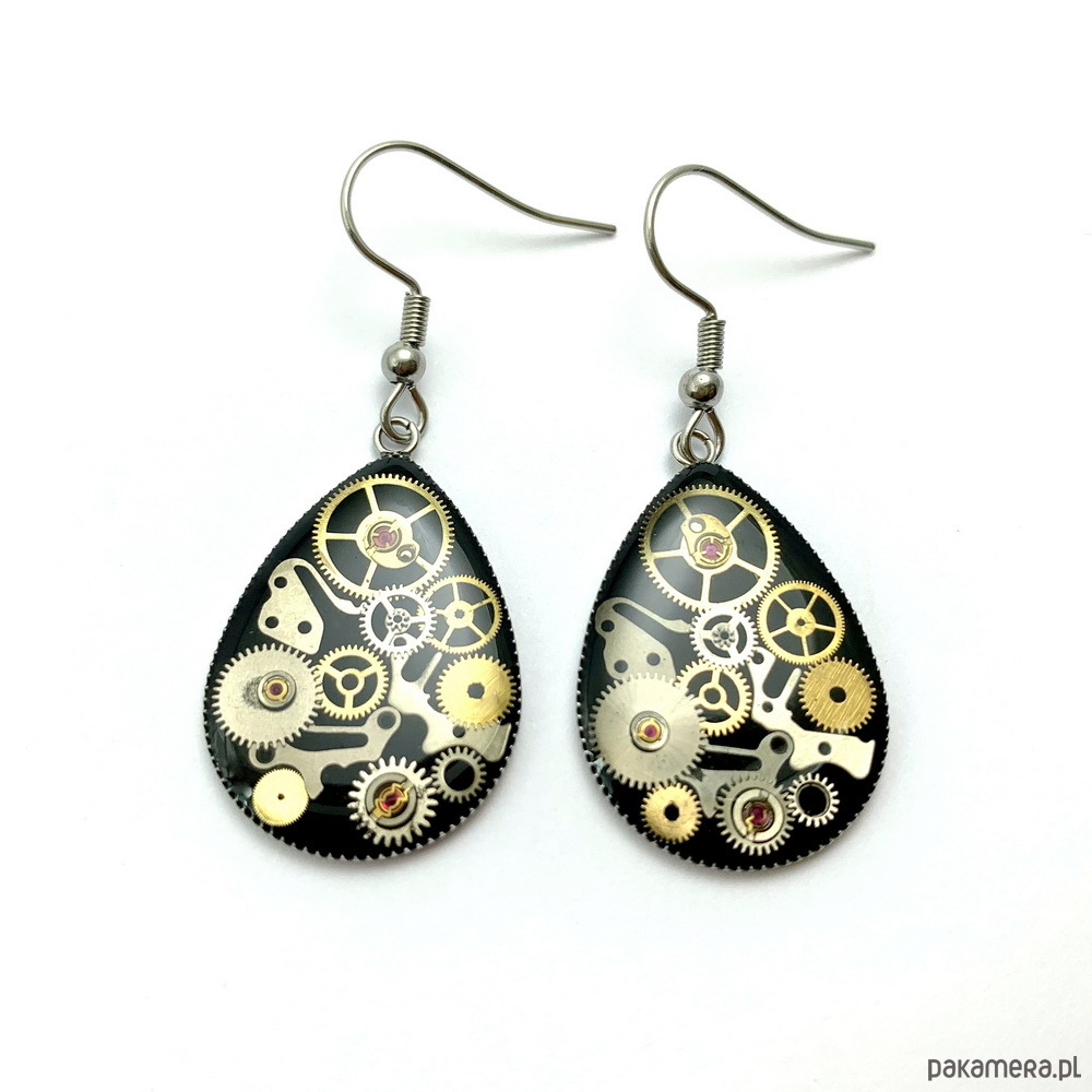 Przepiękne kolczyki, wykonane ręcznie z elementów starych zegarków zatopionych w żywicy. Każda para jest unikalna i niepowtarzalna.