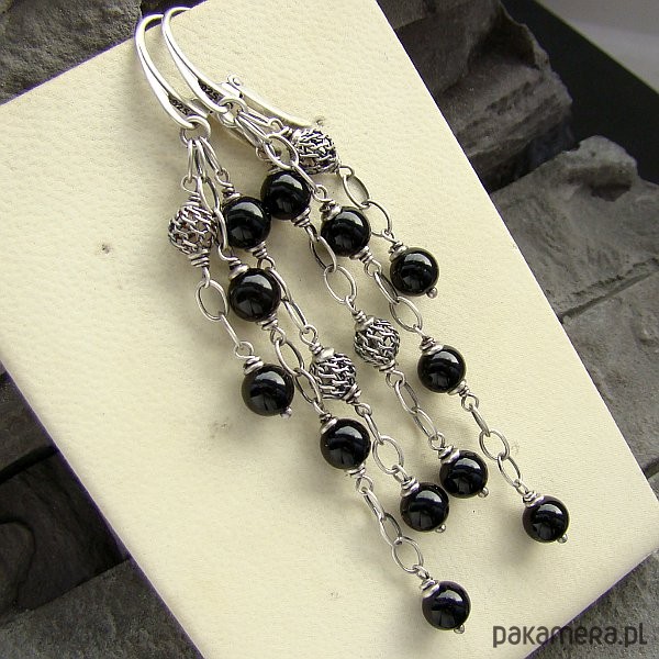 Efektowne, długie i oryginalne kolczyki na co dzień i nie tylko. Wykonane w całości z oksydowanego srebra próby 925 oraz kulek czarnego onyksu wielkości 6 mm. W mojej galerii bransoletka do kompletu. Na życzenie mogę wykoać podobe kolczyki z inymi kaminiami:) Całkowita długość kolczyków to ok. 9 cm. Ozdobnie zapakowane.