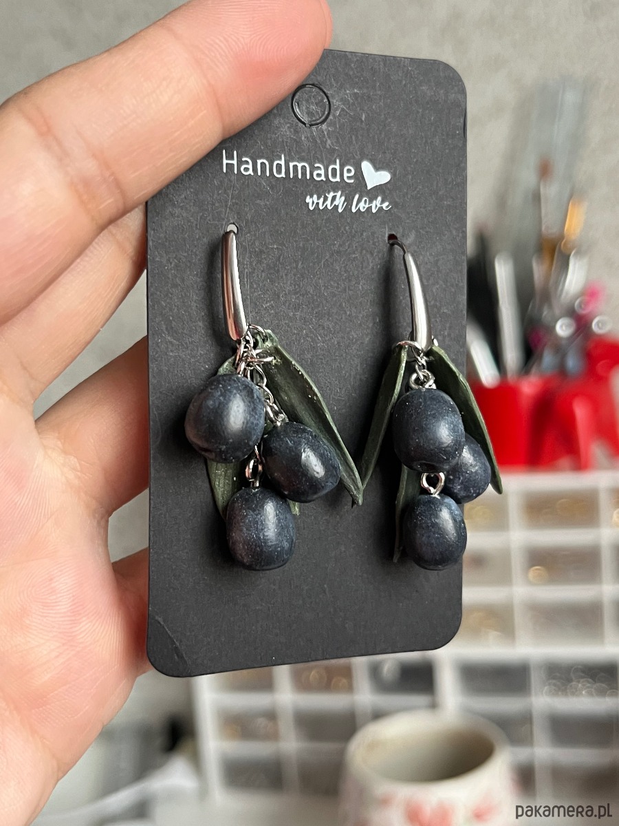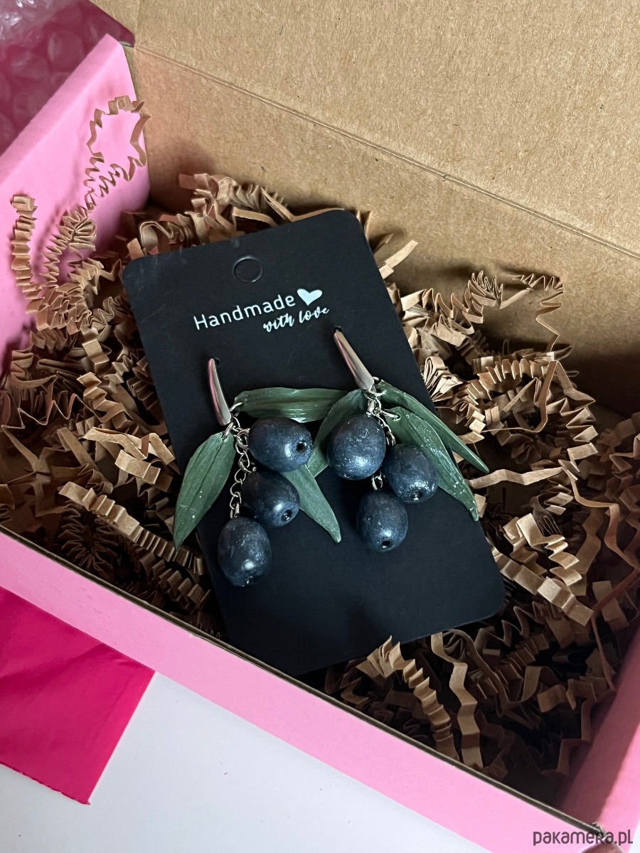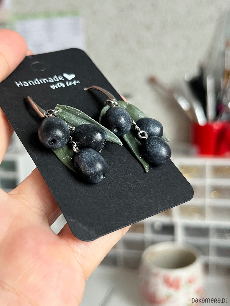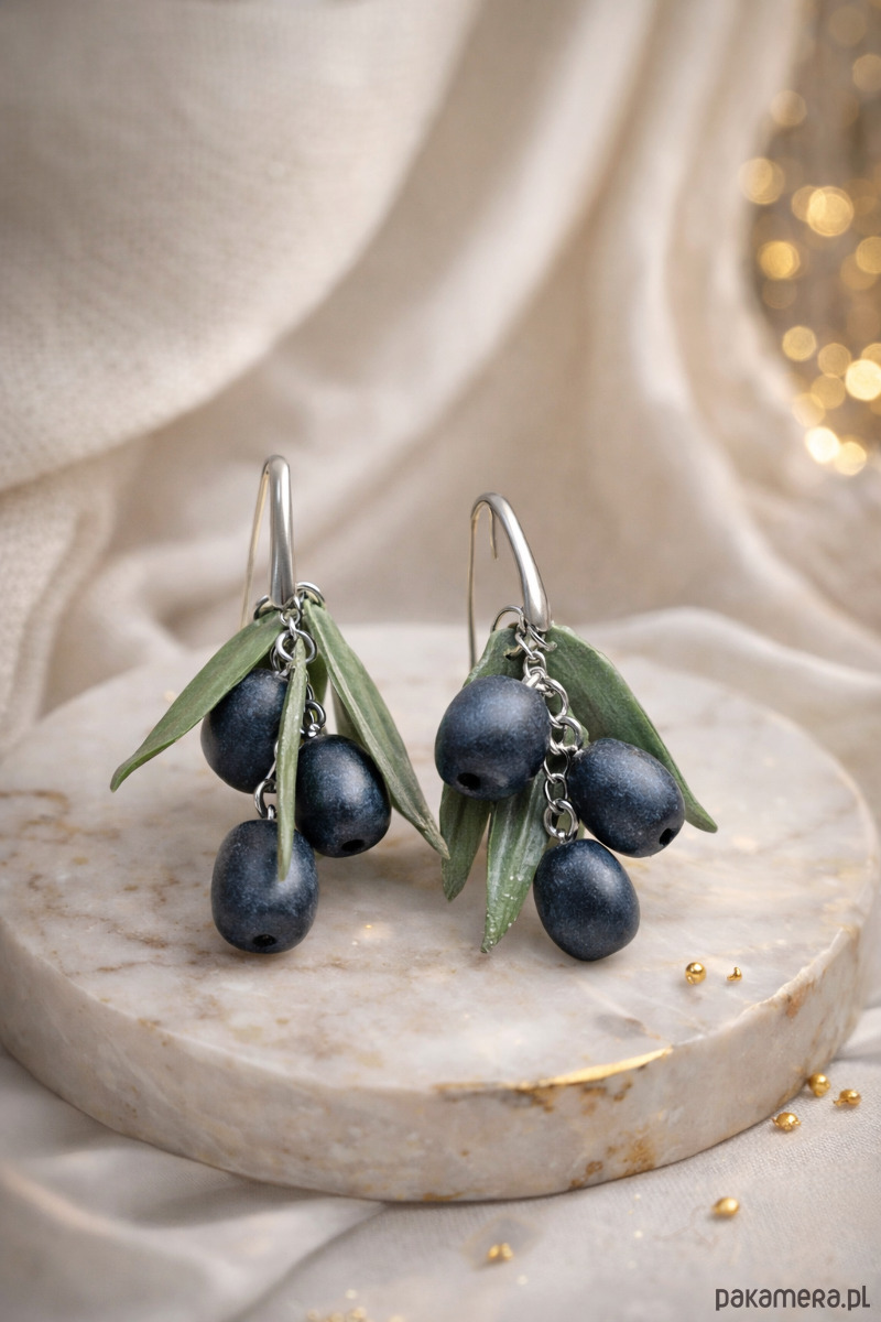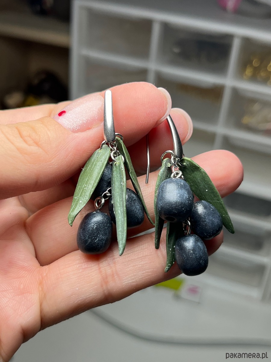Unikatowe, ręcznie wykonane kolczyki inspirowane naturalną gałązką oliwną. Głębokie czarne oliwki w połączeniu z delikatnymi zielonymi liśćmi tworzą wyrazistą, ale elegancką formę inspirowaną śródziemnomorską estetyką.