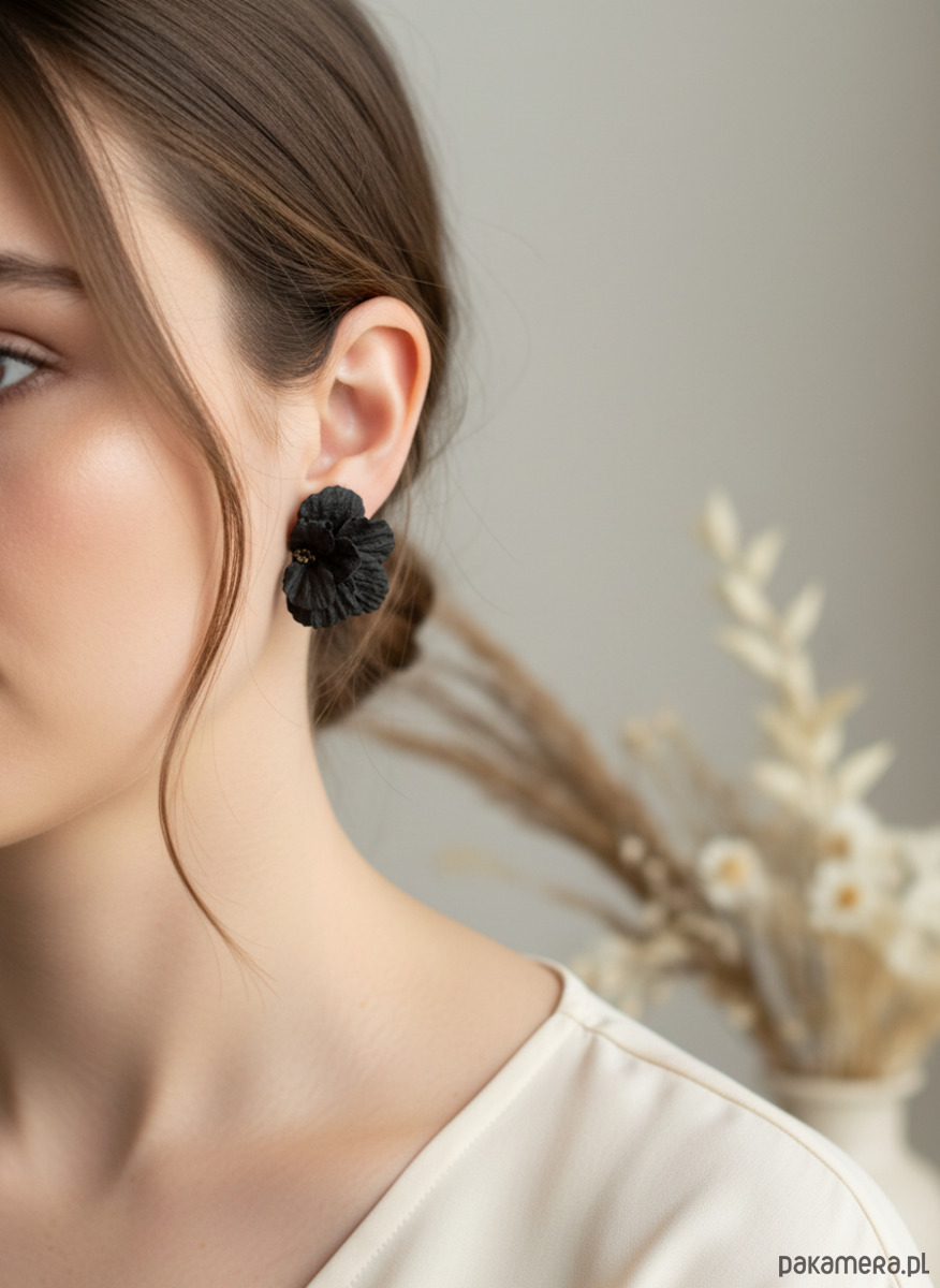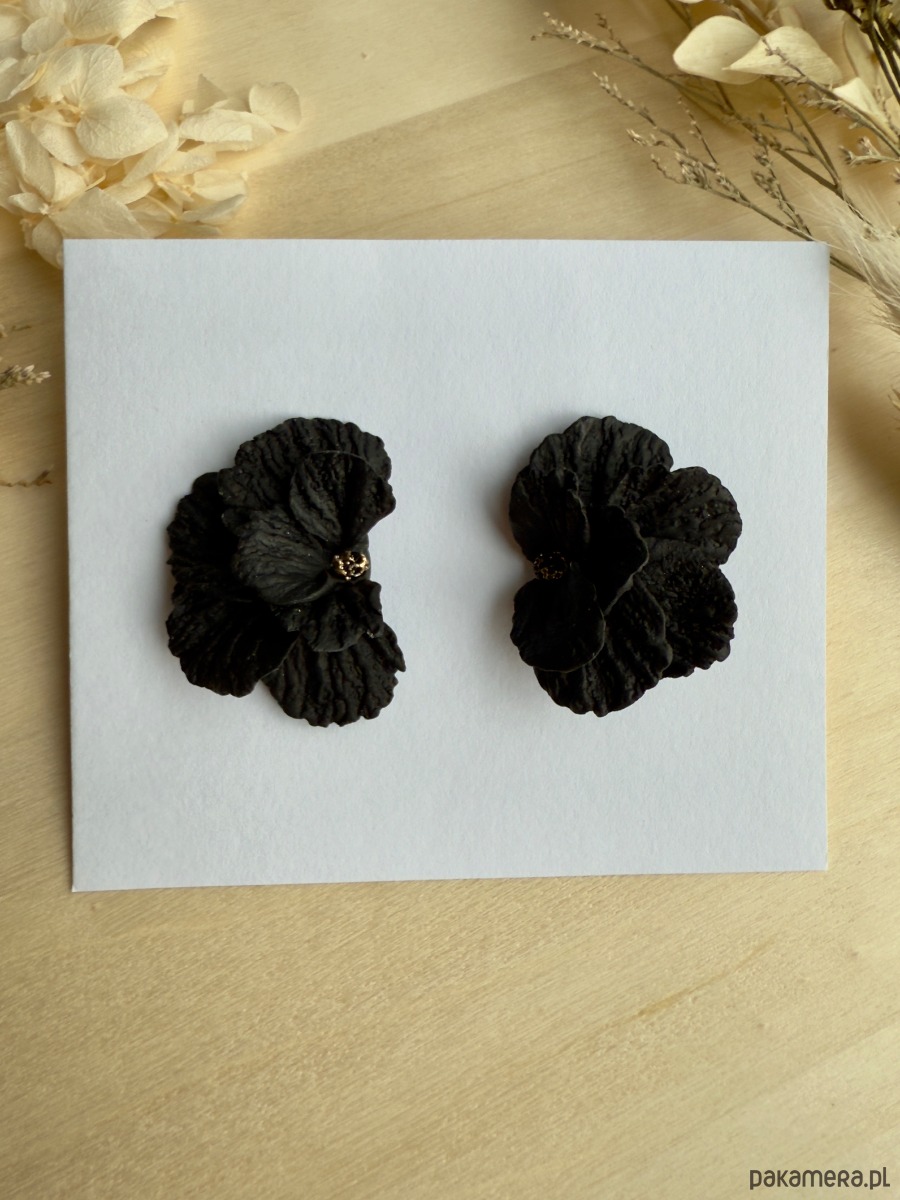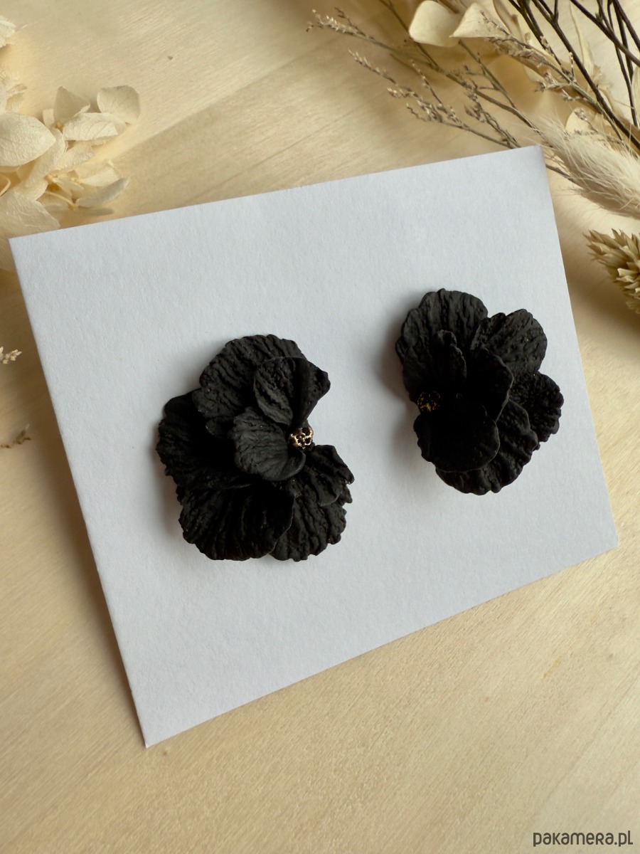 Eleganckie kolczyki w formie przestrzennych, czarnych kwiatów, modelowanych z dbałością o każdy płatek. Matowa powierzchnia i delikatne złote akcenty w centrum sprawiają, że to idealny dodatek do wieczorowych i minimalistycznych stylizacji.