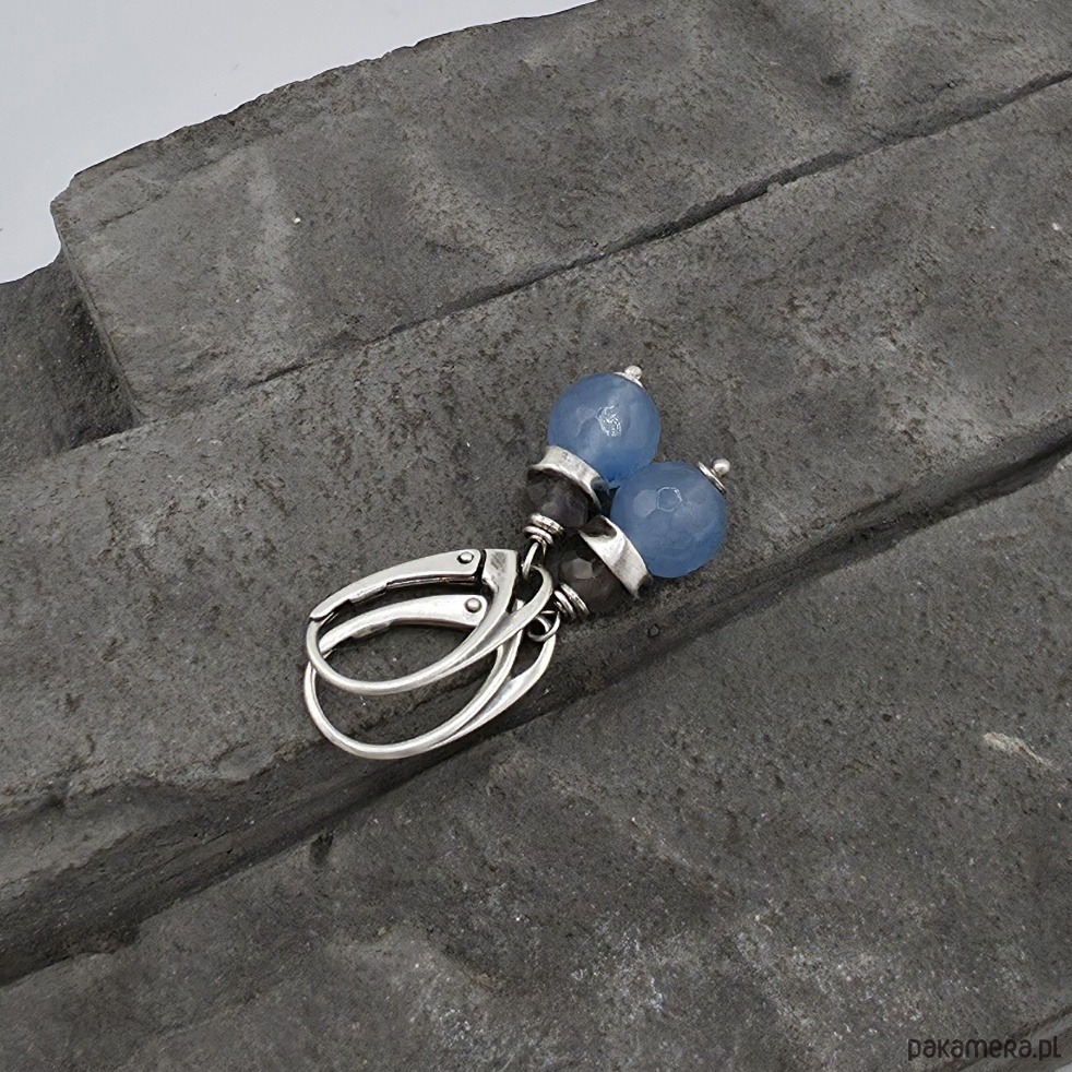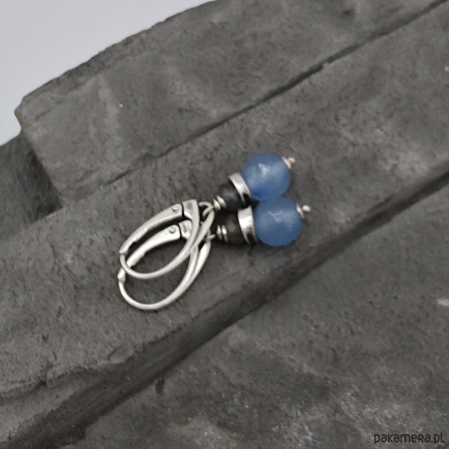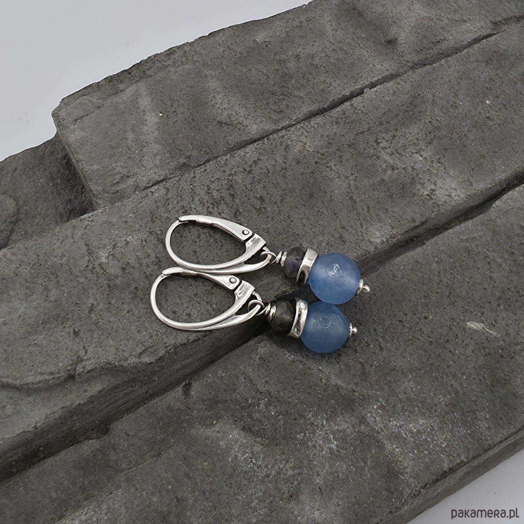 Minimalistyczne kolczyki na co dzień. Wykonane w całości z oksydowanego srebra próby 925 oraz fasetowanych kul jadeitu o błękitnej barwie wielkości ok. 0.8 cm i fasetowanych oponek labradorytu. Zapięcia typu angielskiego, zatrzaskowe. Całkowita długość kolczyków to ok. 3,5 cm. Na zyczenie mogę je wykonać bez oksydy lub z innymi kamieniami. Ozdobnie zapakowane.