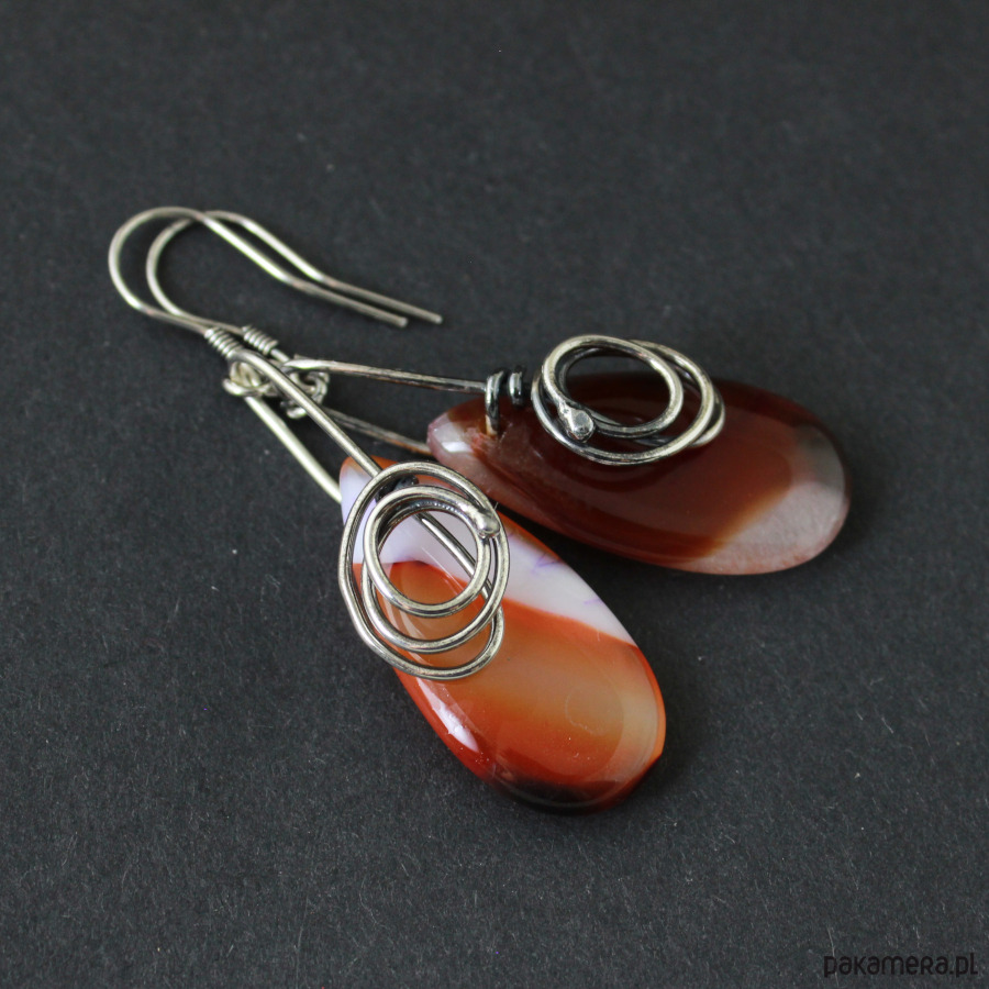 Oprawa z oksydowanego srebra próby 925 oplata agat lekką, nieco surową spiralą, celowo asymetrycznie, jak swobodnie zapisany ruch dłoni. Odcienie metalu — srebrny, szary i głęboka czerń — tworzą kontrast z ciepłem kamienia, podkreślając jego wielowarstwową naturę. Całość ma 5,9 cm długości i 1,5 cm szerokości, a każdy detal — od formowania drutu, przez osadzenie kamienia, po oksydowanie i polerowanie — powstał ręcznie. Agat, znany z właściwości harmonizujących i wzmacniających wewnętrzny spokój, wnosi do projektu nutę subtelnej energii. Kolczyki wykonano w pojedynczym egzemplarzu i zapakowane zostaną w eleganckie etui.