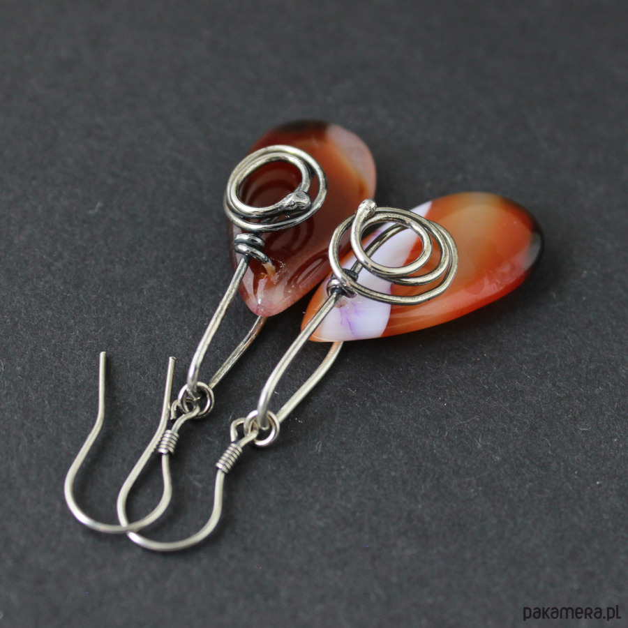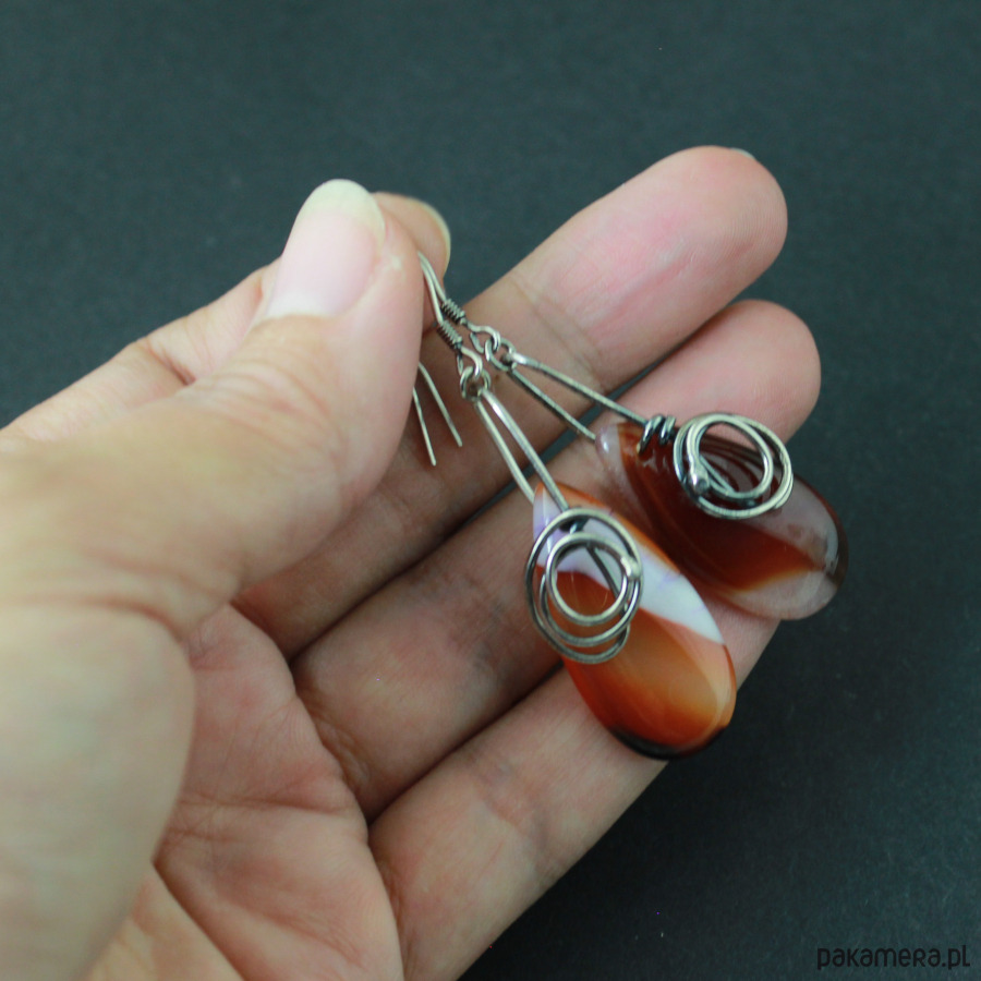 W tych kolczykach zaklęty jest kolor, który zdaje się pamiętać o ogniu, ziemi i miękkim świetle wschodzącego dnia. Krople agatu, gładkie jak wypolerowane szkło, przybierają barwy od głębokiej rudości przypominającej ciepło rozżarzonego węgla, po mleczne pasma bieli i delikatnego różu, jakby ktoś namalował je pędzlem zamoczonym w poranną mgłę. Tu i ówdzie pojawia się półprzezroczysty cień herbacianego brązu, łagodnie przechodzący w subtelny bursztynowy odcień. Kształt kamienia — wydłużona kropla o miękko zaokrąglonych krawędziach — sprawia wrażenie, jakby na chwilę zatrzymała się w locie, nim spłynęłaby po skórze jak ciepły deszcz.