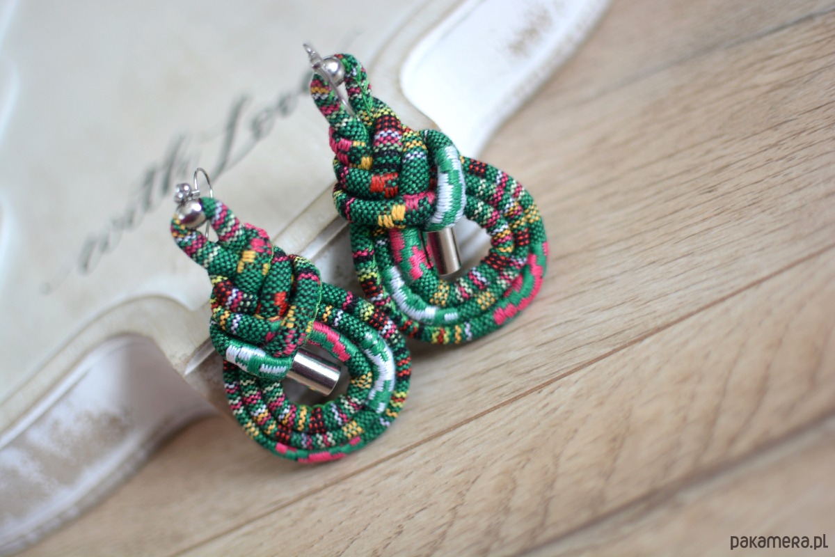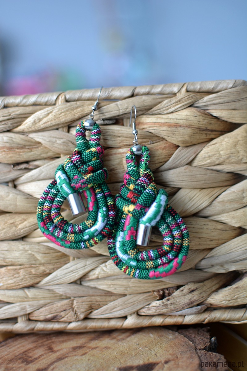 Etniczne, lekkie kolczyki misternie wyplecione z okrągłego, szytego rzemienia-liny z tkaniny o średnicy 4mm. Do ich wykonania użyto ponadto elementów metalowych ze stali szlachetnej.
