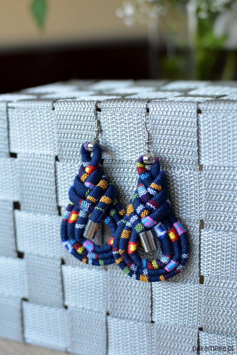 Etniczne, lekkie kolczyki misternie wyplecione z okrągłego, szytego rzemienia-liny z tkaniny o średnicy 4mm. Do ich wykonania użyto ponadto elementów metalowych ze stali szlachetnej.