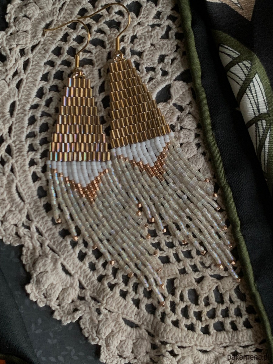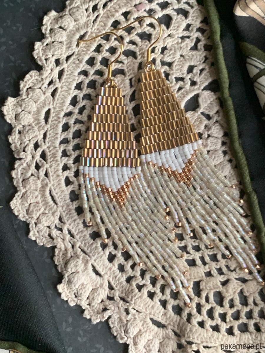 Koraliki w kolorze zgaszonego złota, śnieżnej bieli i kryształów.