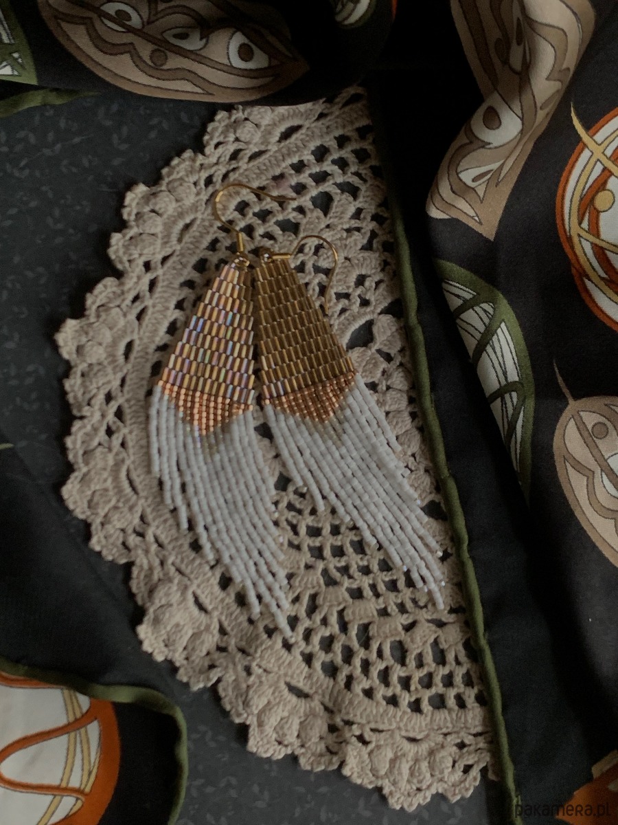 Koraliki w kolorze zgaszonego złota, śnieżnej bieli.