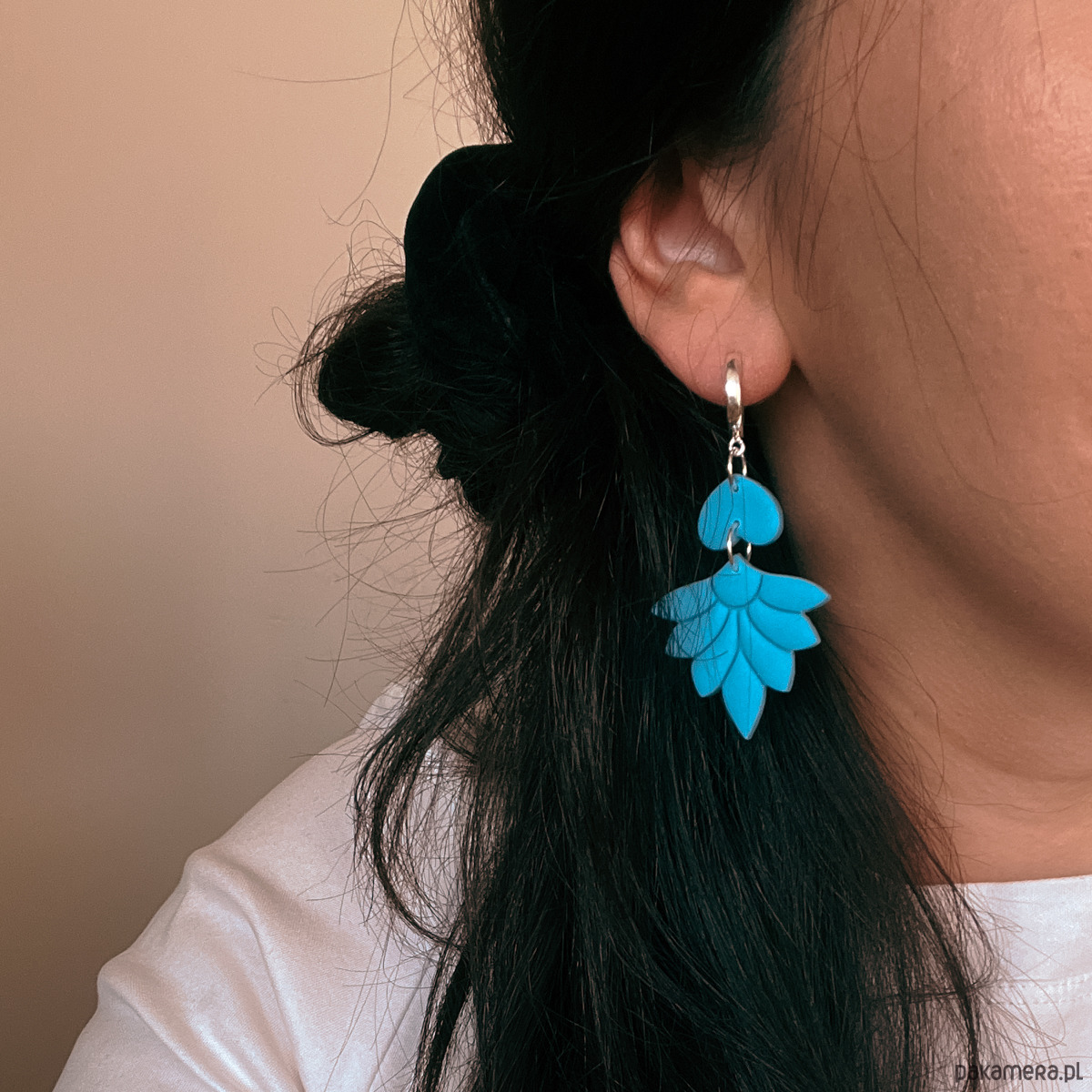 Długie, wiszące kolczyki w stylu boho z kwiatem lotosu. Przepiękny, przykuwający oko, odcień niebieskiego. Kolczyki, mimo swych rozmiarów, są ultralekkie i komfortowe w noszeniu.