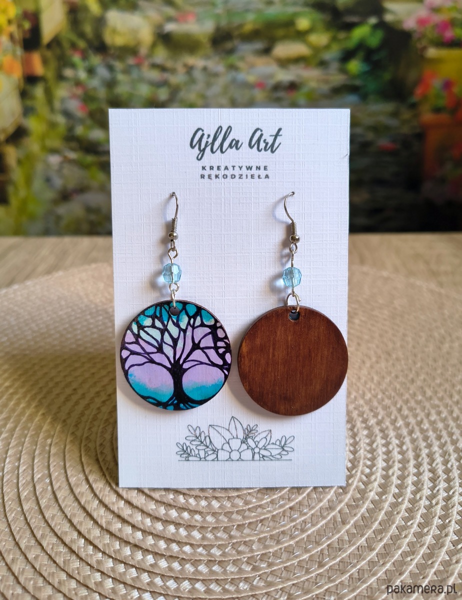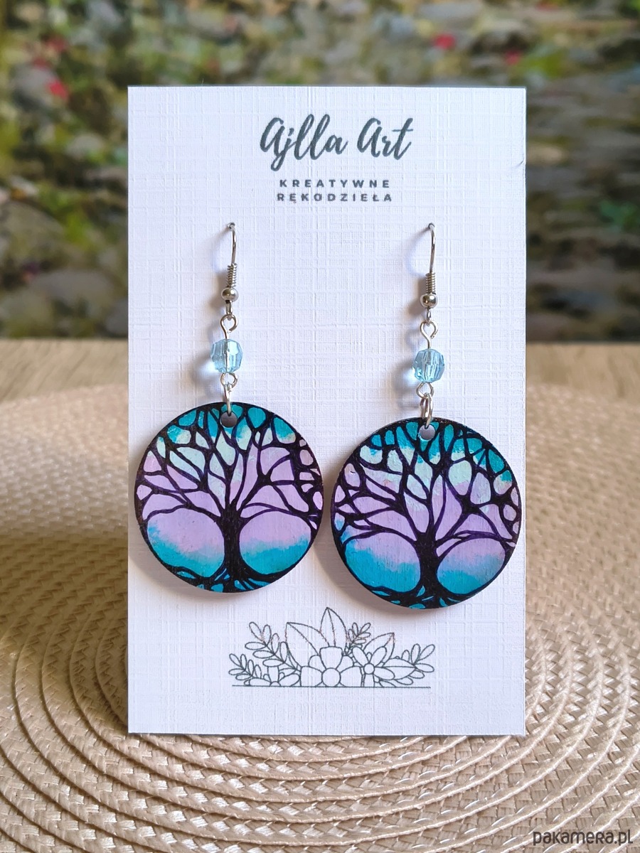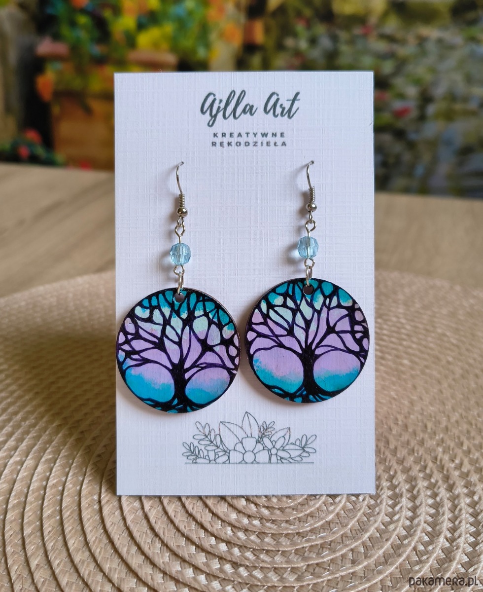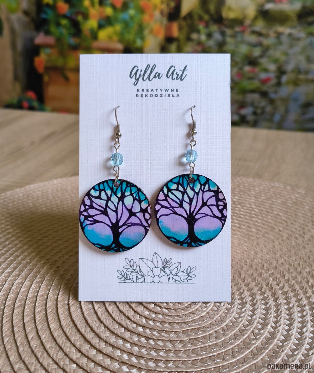 Lekkie kolczyki drewniane ręcznie malowane farbami akrylowymi z motywem drzewa.