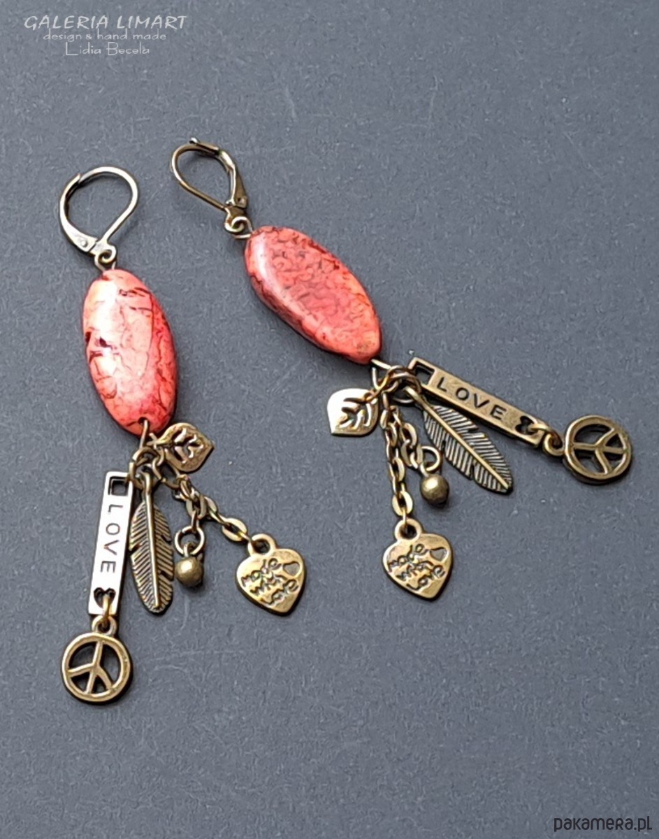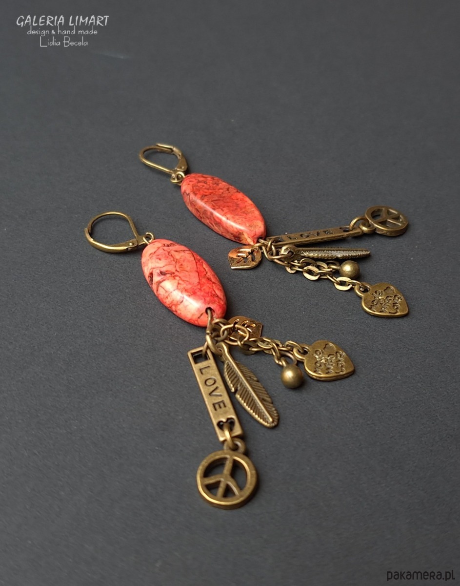 Autorskie długie kolczyki utrzymane w duchu biżuterii BOHO z wpływami etnicznymi, ciekawe, efektowne i unikatowe. Niebanalne w swej formie i kolorystyce, czerwień howlitu połączona z ciepłem starego złota. Howlit i mosiądz, spektakularne połączenie.