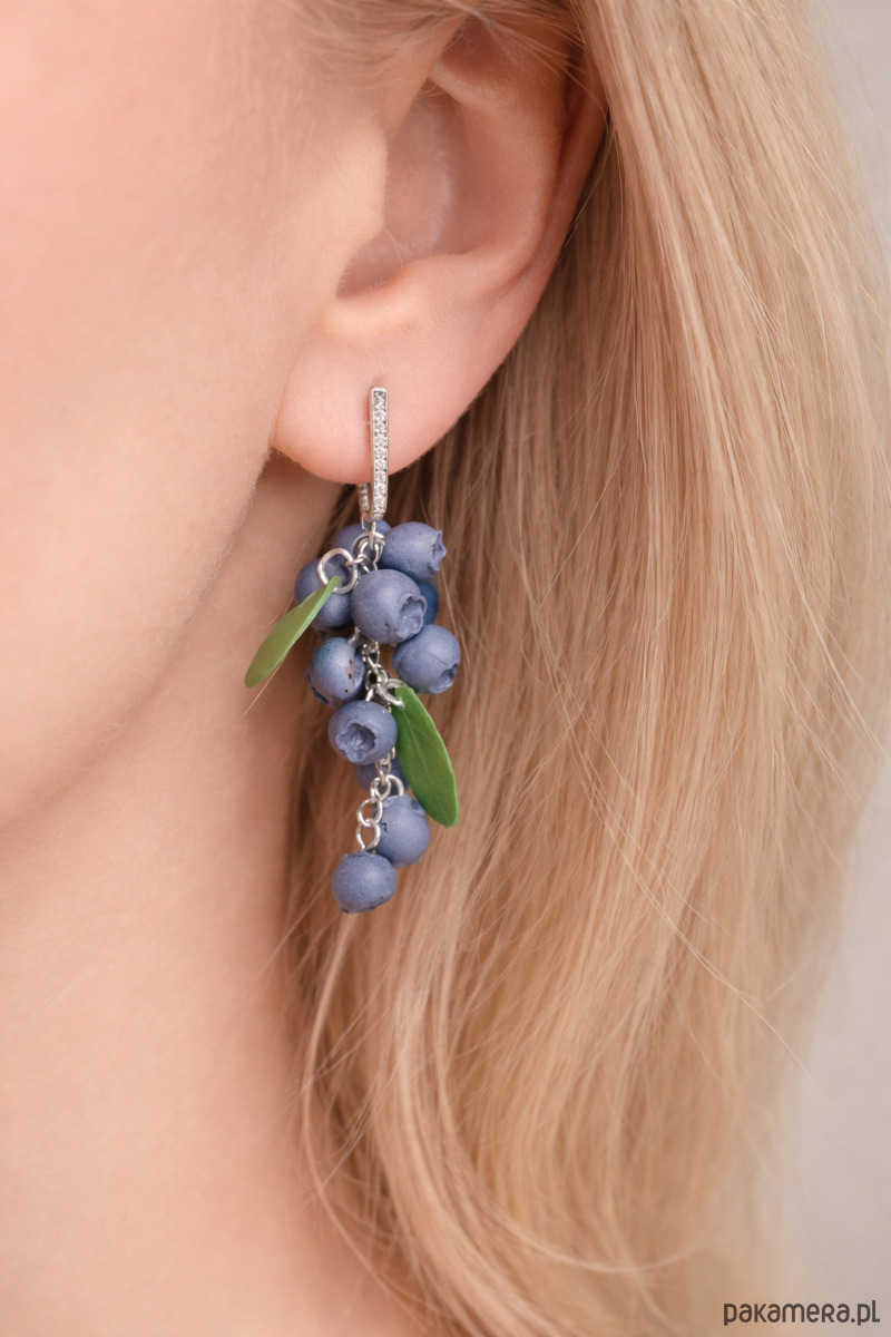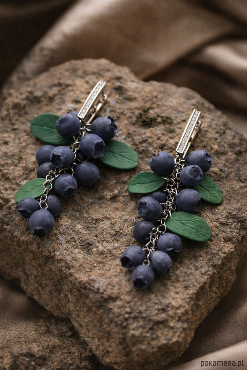 Wyjątkowe kolczyki inspirowane dojrzałymi borówkami prosto z lasu. Każda jagoda została ręcznie uformowana z glinki polimerowej, dzięki czemu biżuteria zyskuje realistyczny, naturalny charakter.