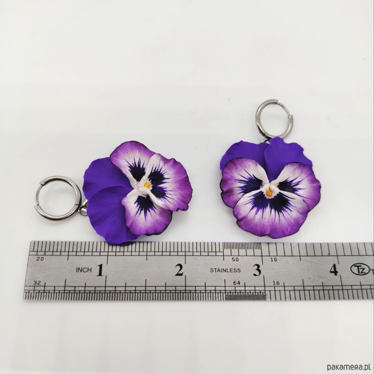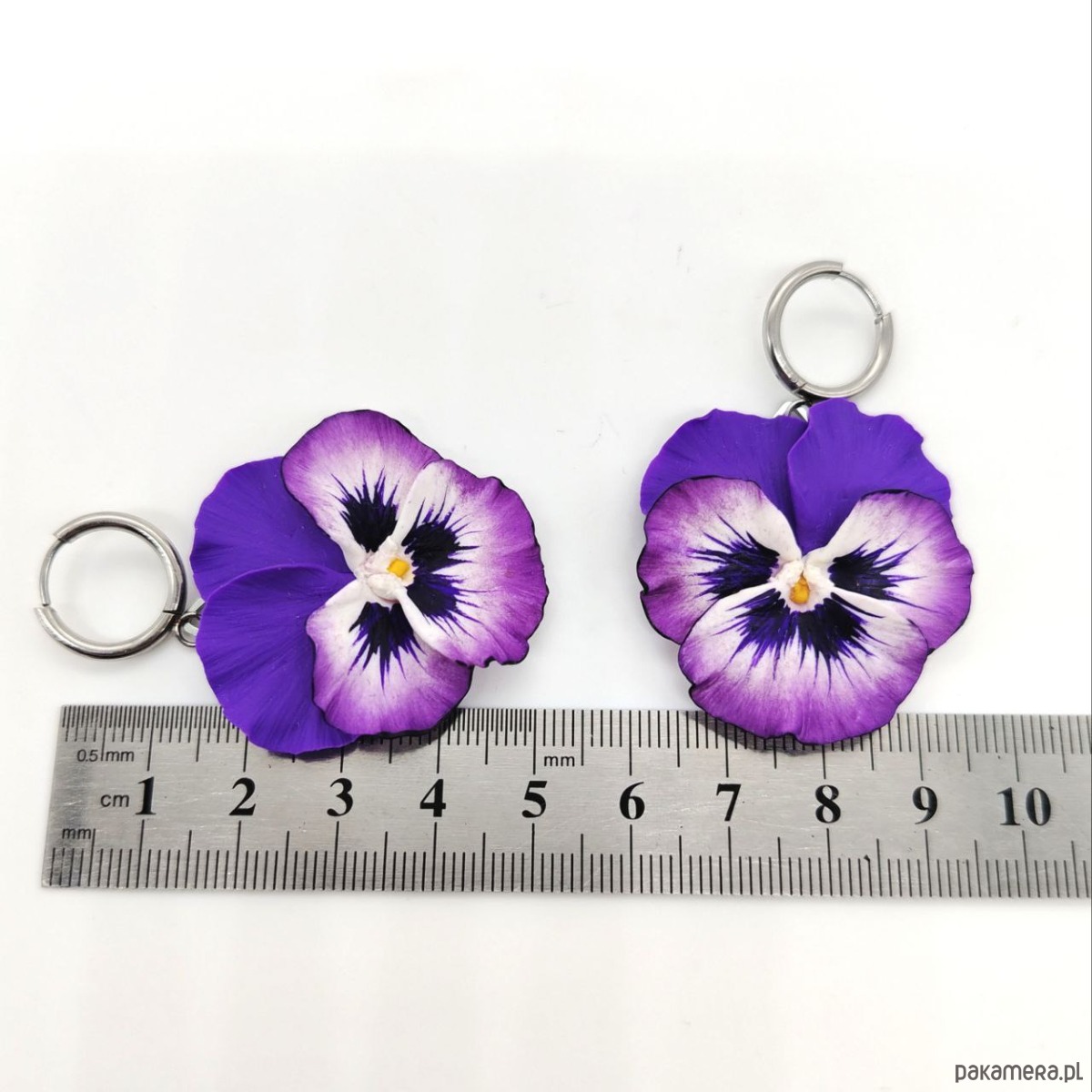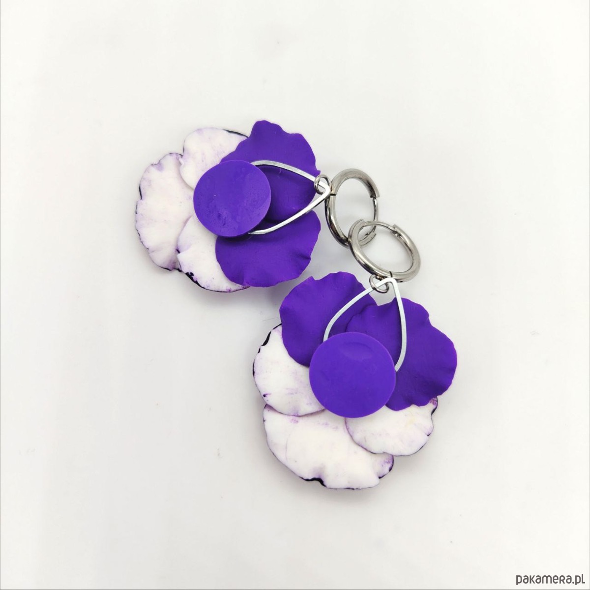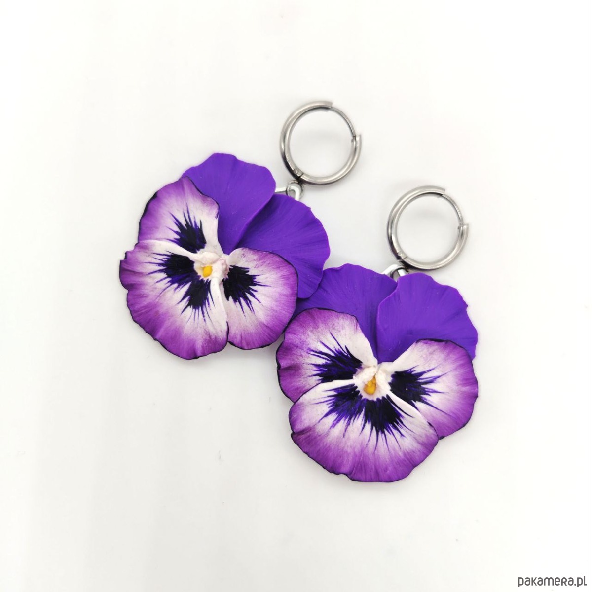 Kolczyki bratki biało fioletowe wiszące handmade, kwiaty z gliny polimerowej