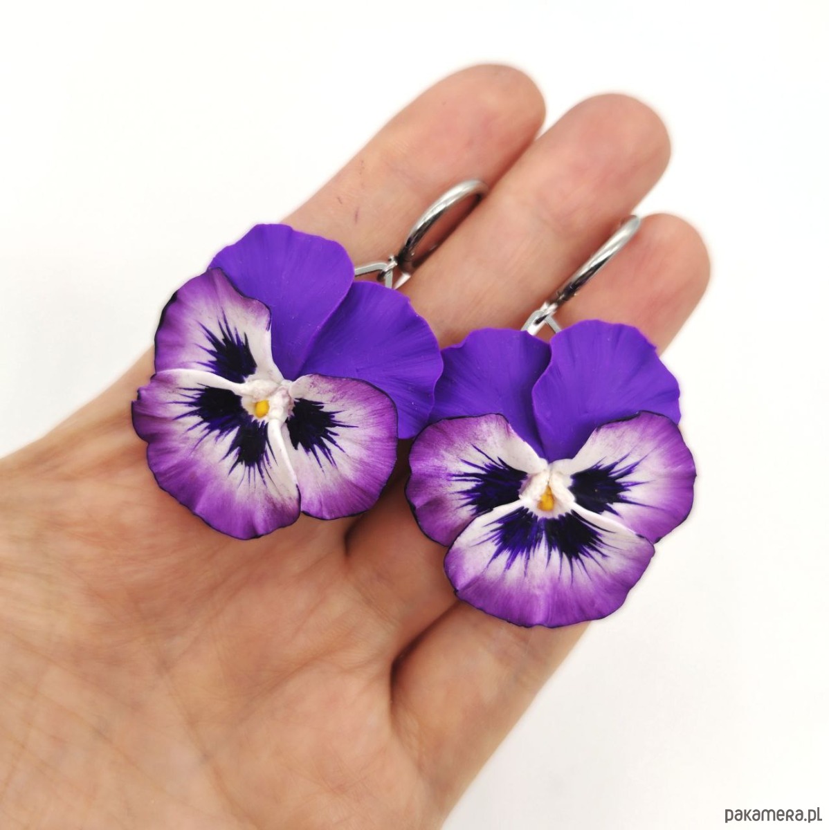 Eleganckie kolczyki bratki w kolorze białym z fioletem. Ręcznie wykonane z gliny polimerowej, z subtelnym przejściem kolorów inspirowanym prawdziwymi kwiatami.