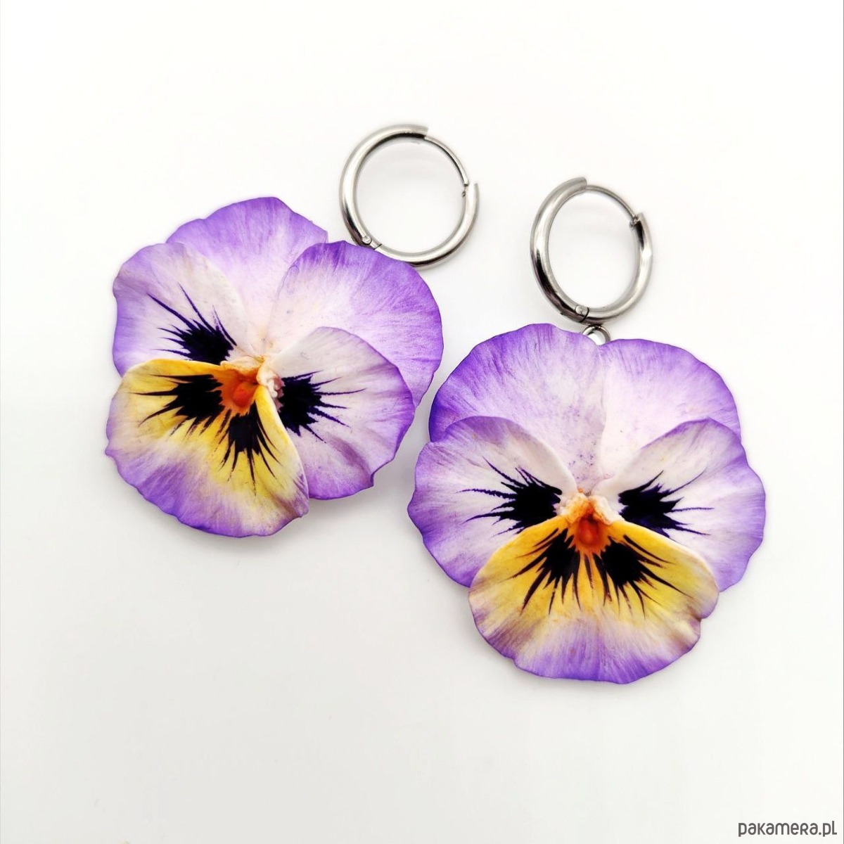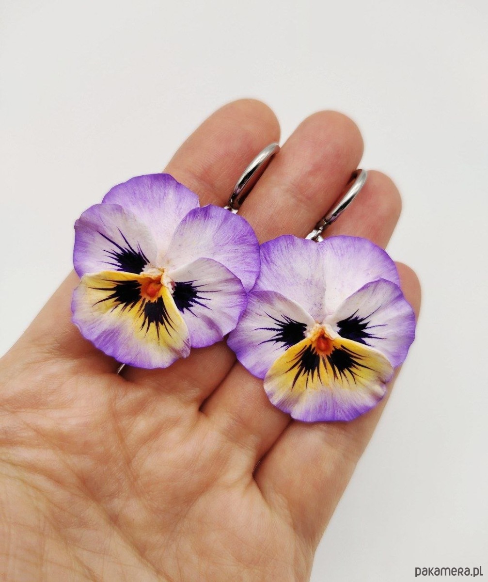 Eleganckie kolczyki bratki w kolorze białym z fioletem. Ręcznie wykonane z gliny polimerowej, z subtelnym przejściem kolorów inspirowanym prawdziwymi kwiatami.
