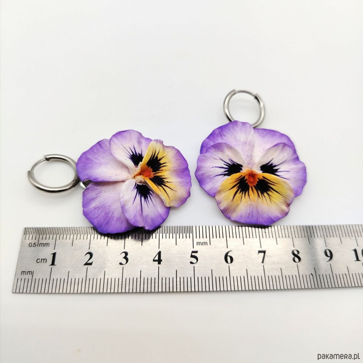 Kolczyki bratki biało fioletowe wiszące handmade, kwiaty z gliny polimerowej