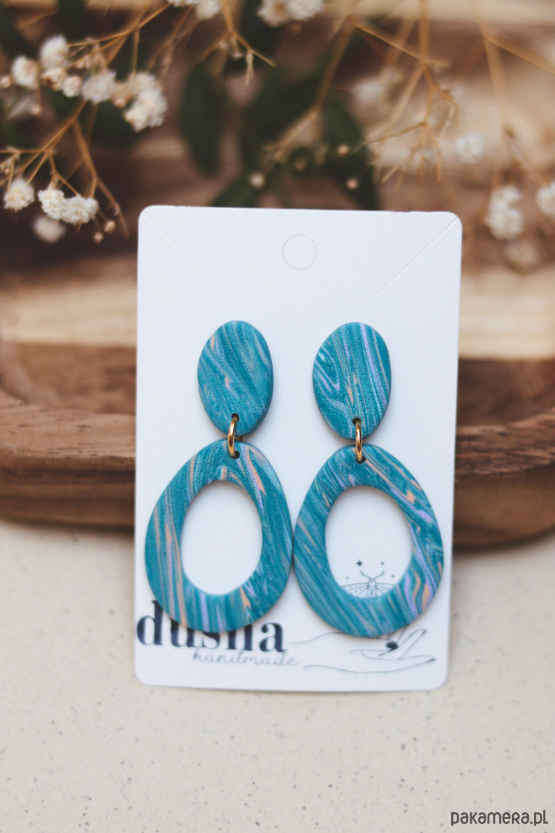 Oryginalne kolczyki o wzorze przypominającym morskie fale. Obok odcieni błękitu można w nich dostrzec ciepły kolor pisaku oraz pastelowy fiolet.