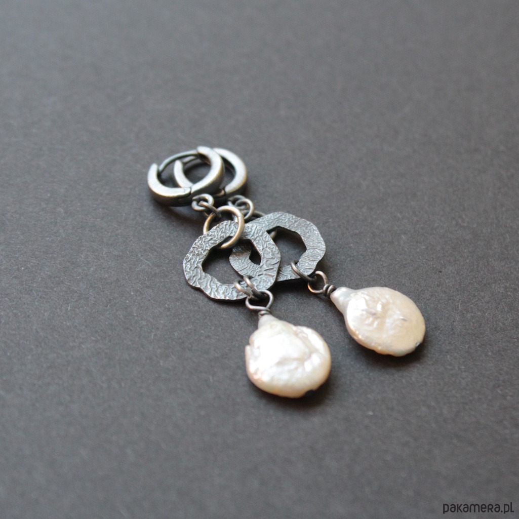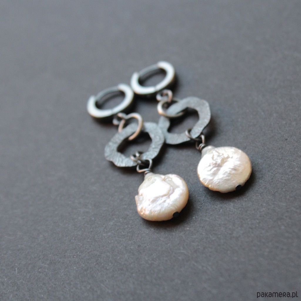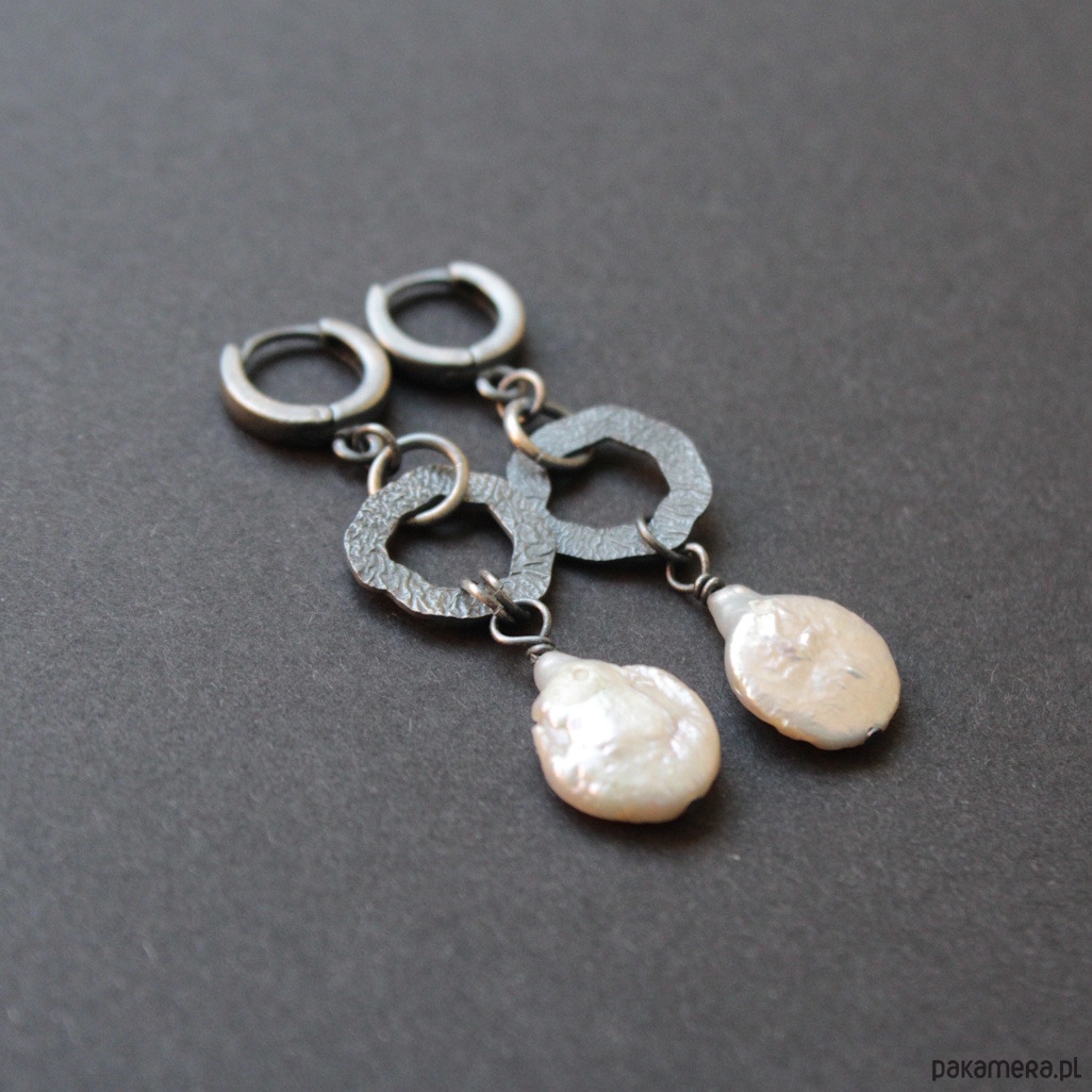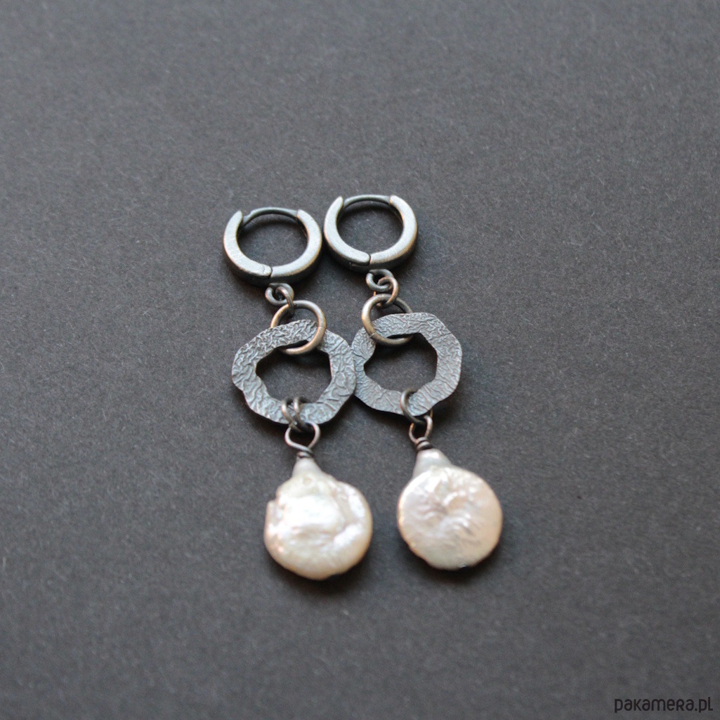 Kolczyki wykonane zostały z mocno oksydowanego srebra próby 925 oraz hodowlanych perełek wielkości 1,6 cm.