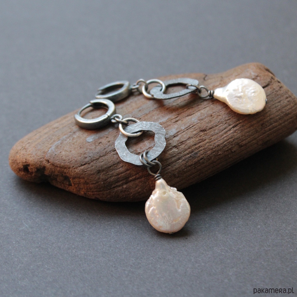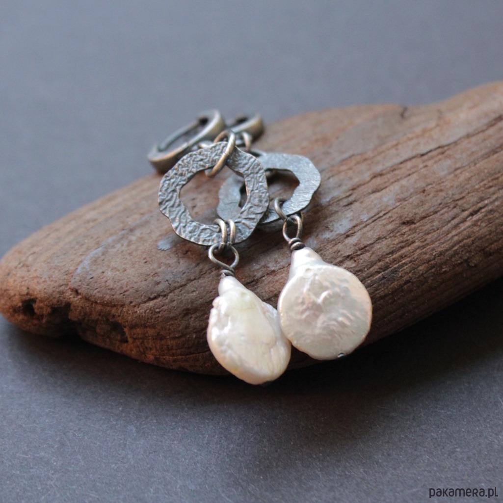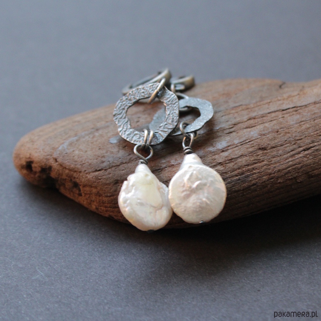 Perły zawieszone zostały na srebrnych młotkowanych biglach i nieregularnym owalu.