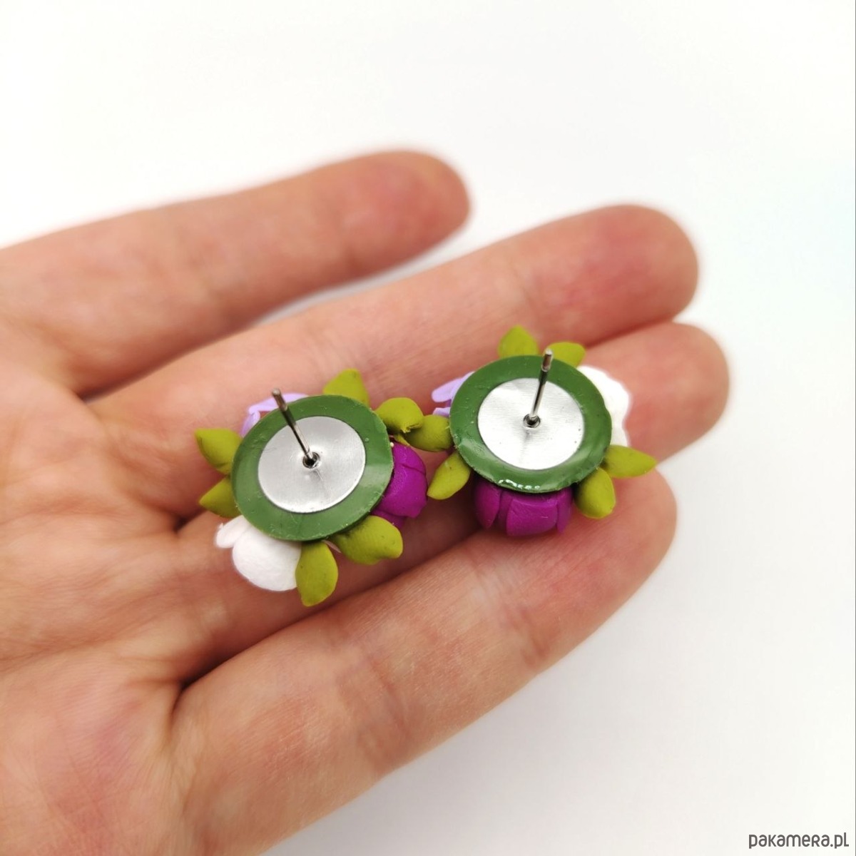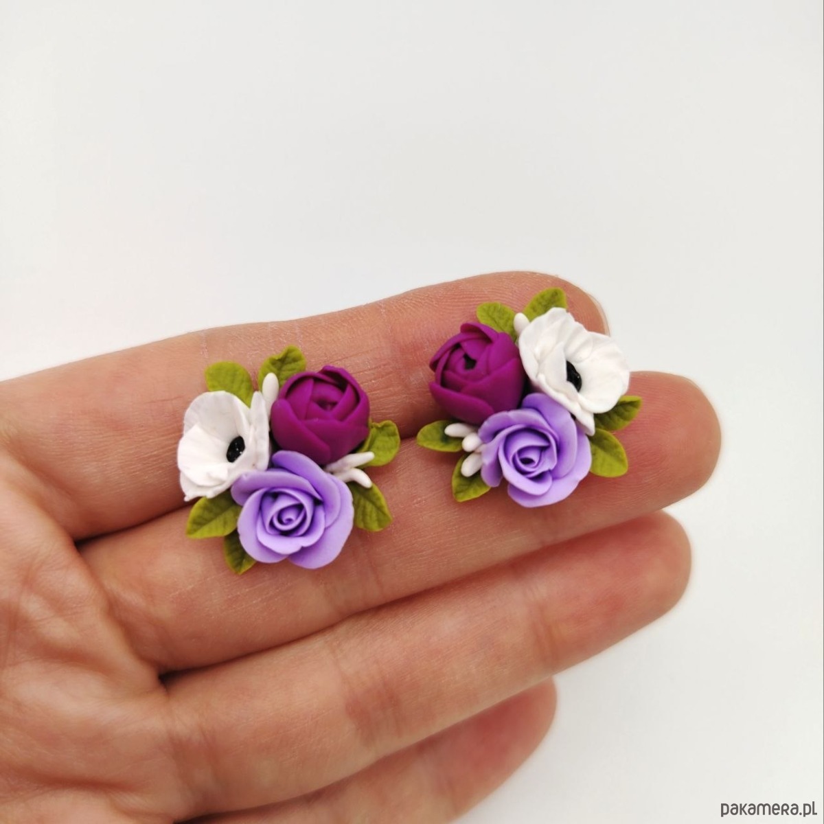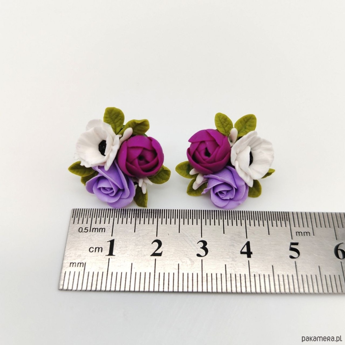 Każdy element został starannie uformowany z zapiekanej gliny polimerowej, tworząc realistyczną, delikatną kompozycję kwiatową. To biżuteria, która przyciąga spojrzenia swoją subtelnością i wyjątkowością.