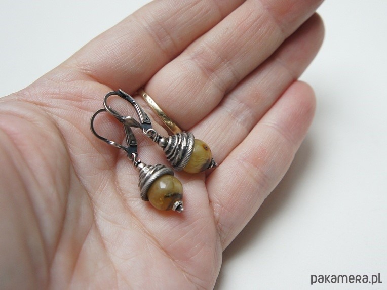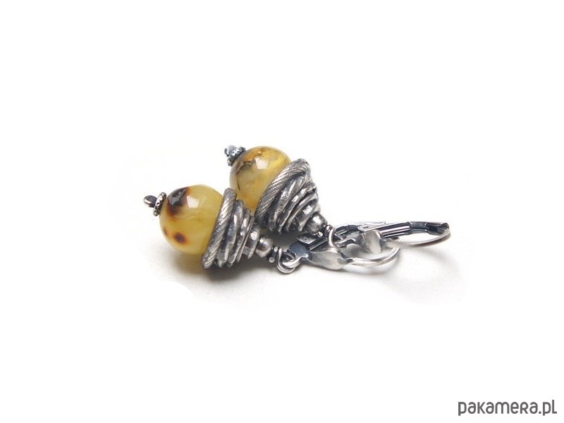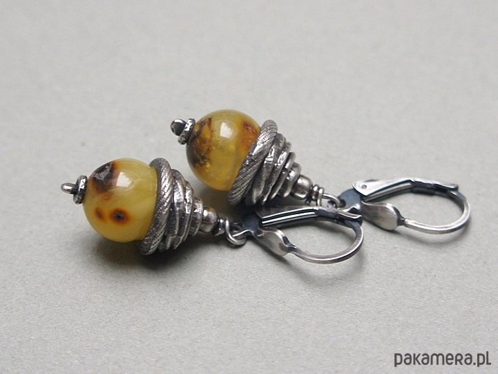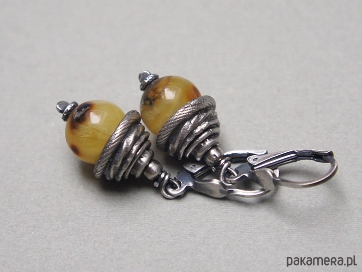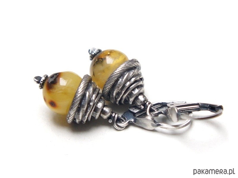 Kolczyki wykonane ze srebra [pr. 925] w połączeniu z kuleczkami bursztynów [10mm]. Całość oksydowana i przetarta. Całkowita długość kolczyków 4cm. Biżuteria ozdobnie zapakowana.