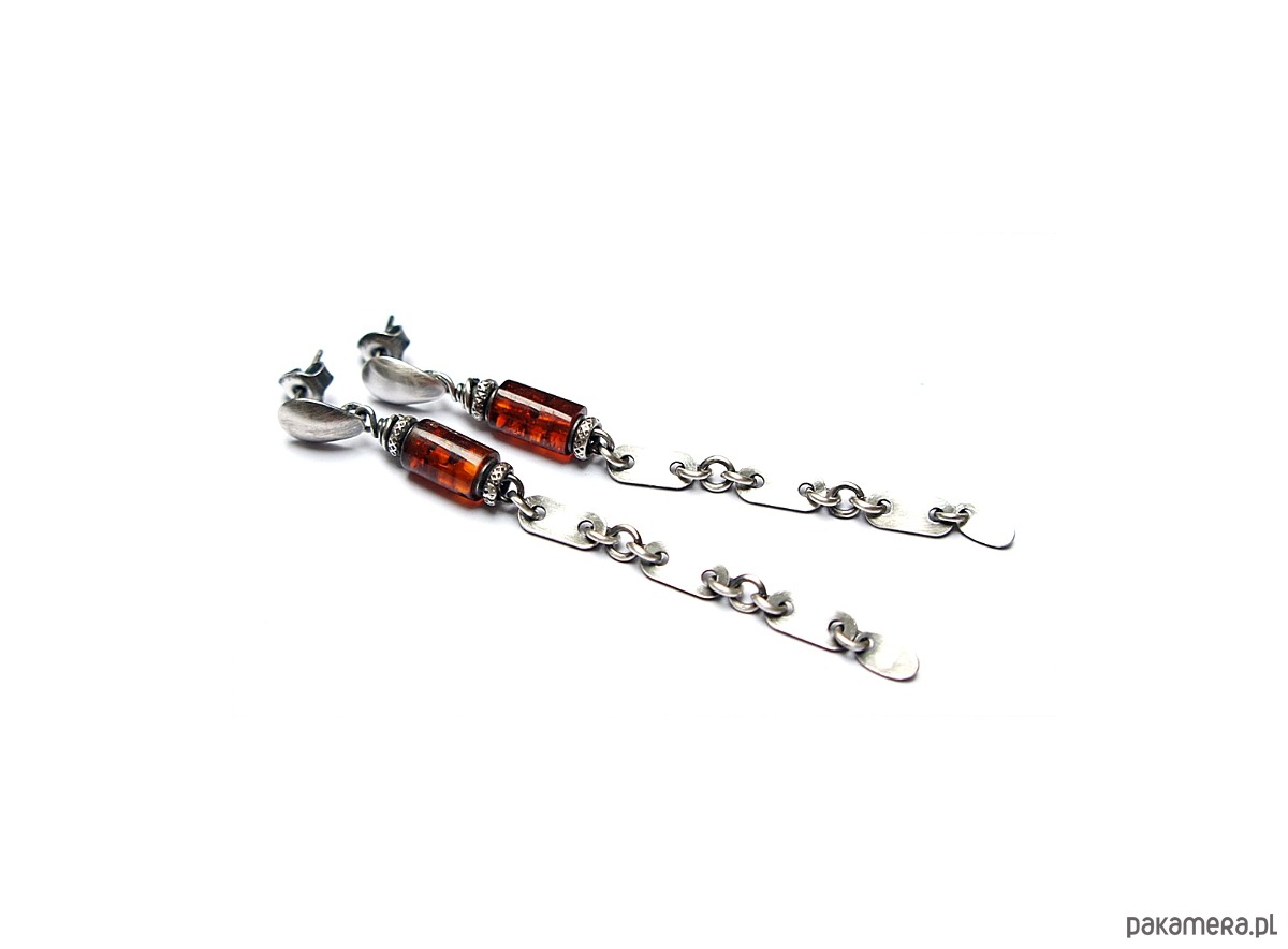 Kolczyki wykonane ze srebra [pr.925] w połączeniu z wałeczkami naturalnych bursztynów [6mm]. Srebro oksydowane i przetarte. Całkowita długość kolczyków 7cm. Biżuteria ozdobnie zapakowana