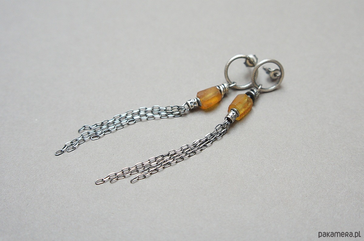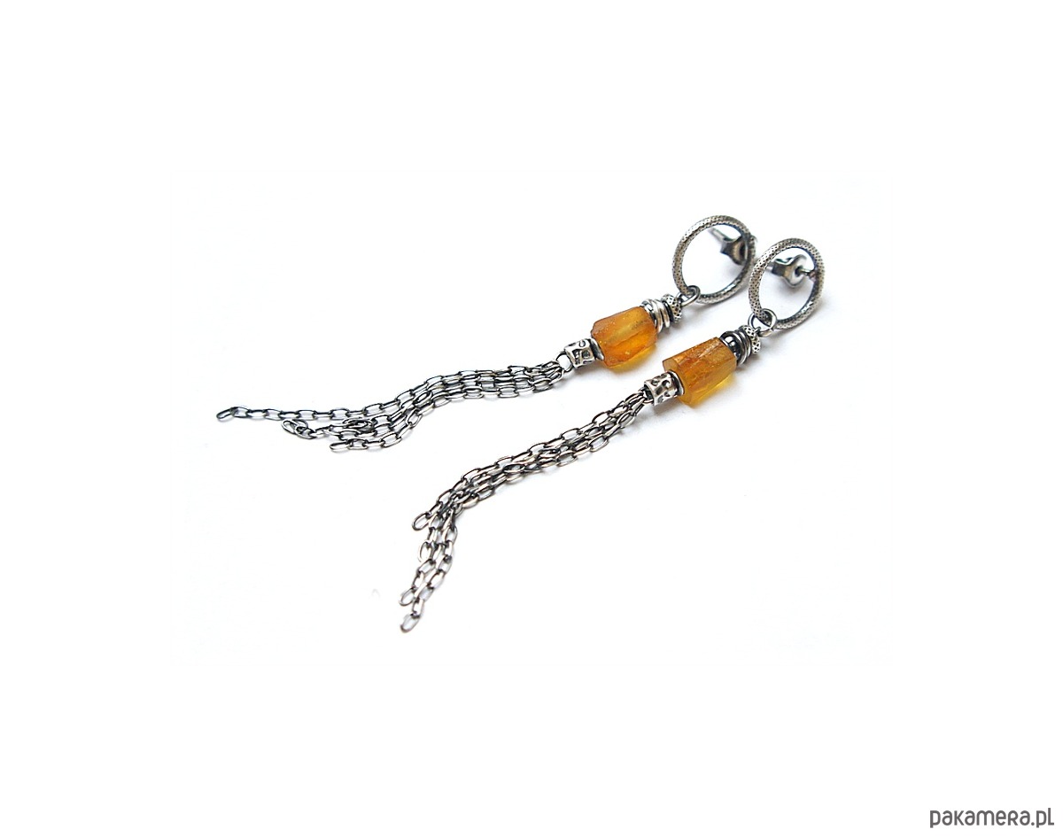 Kolczyki wykonane ze srebra [pr.925] w połączeniu z surowymi bryłkami bursztynów wałeczkami naturalnych bursztynów [10mm x 8mm]. Srebro oksydowane i przetarte. Całkowita długość kolczyków 8cm. Biżuteria ozdobnie zapakowana