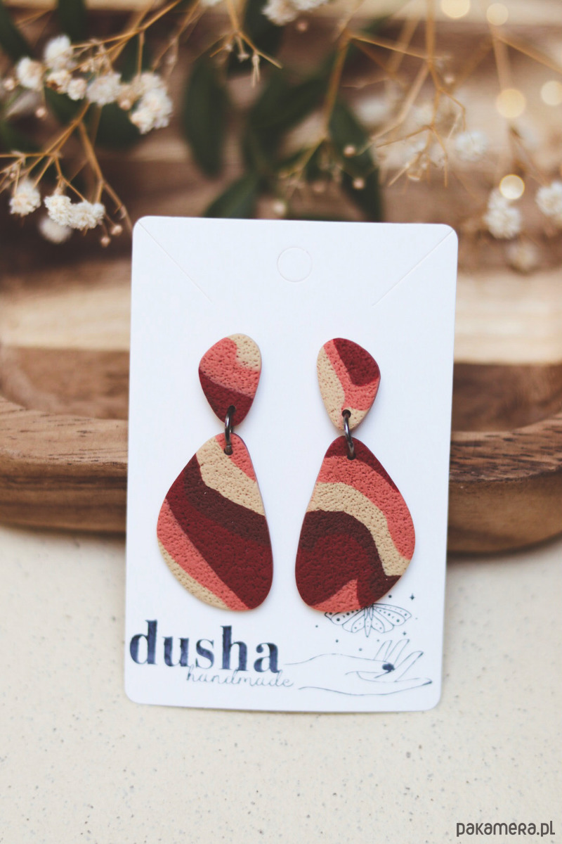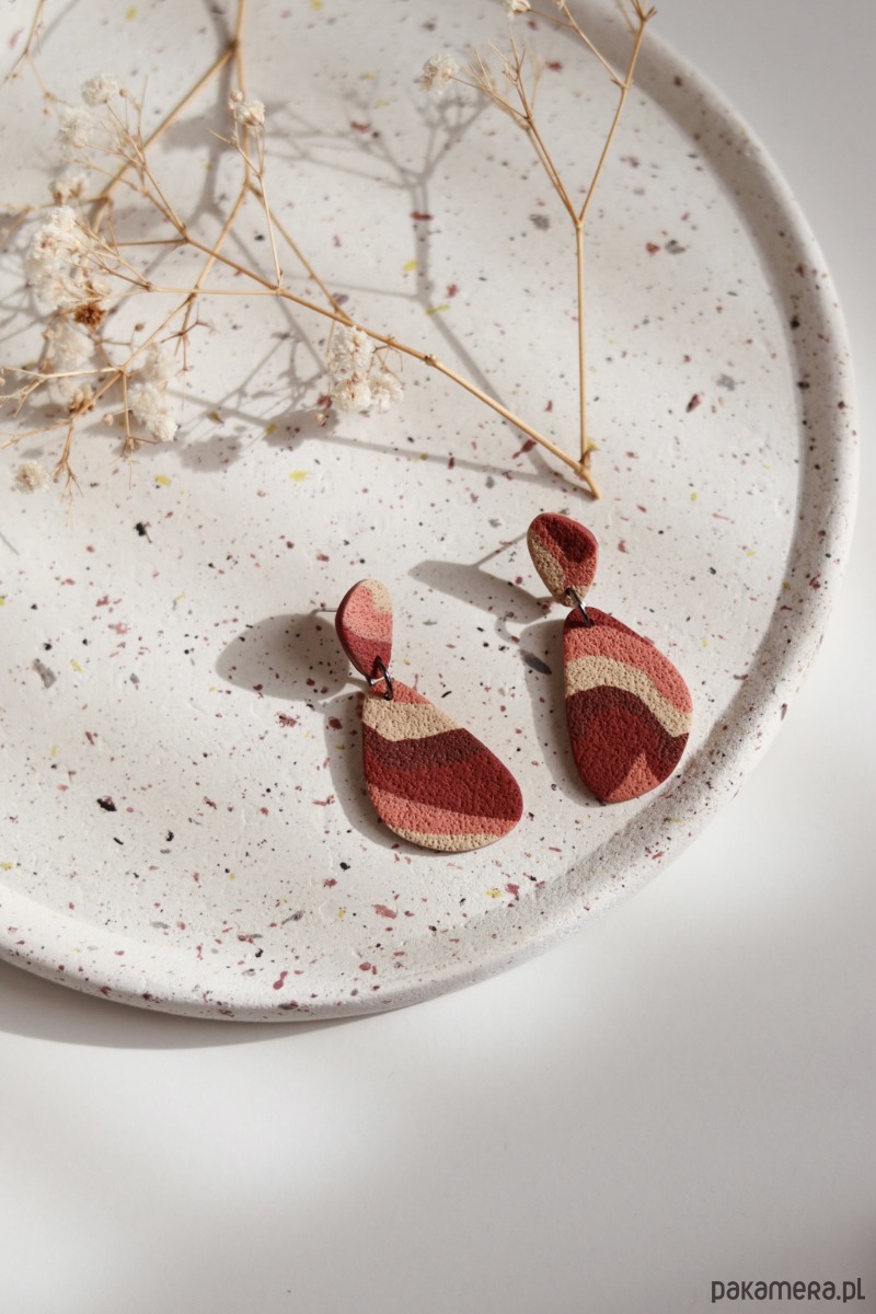 Wiszące kolczyki o abstrakcyjnym wzorze w zgaszonych odcieniach beżu, różu i czerwieni. Kompozycja została wykończona oryginalną chropowatą fakturą. Kolczyki są cienkie i bardzo lekkie, praktycznie nie czuć ich na uszach.