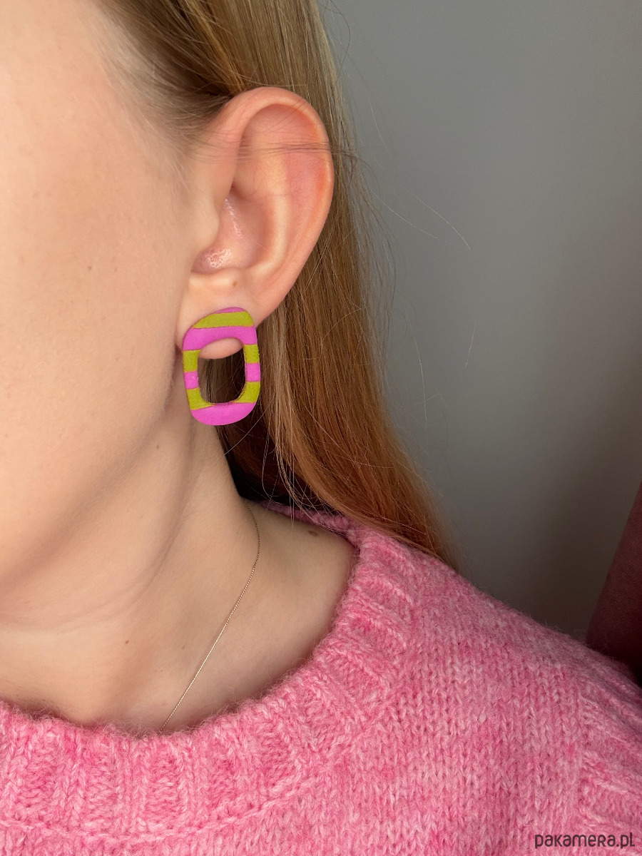 Ręcznie wykonane kolczyki o wysokości 3 cm, które są definicją nowoczesnej odwagi i koloru. Wyraziste połączenie neonowego różu oraz soczystej limonki. Bardzo lekkie, a dzięki zastosowaniu sztyftów ze stali chirurgicznej są bezpieczne dla wrażliwych uszu. To idealny wybór dla osób, które nie boją się szalonych połączeń kolorów.