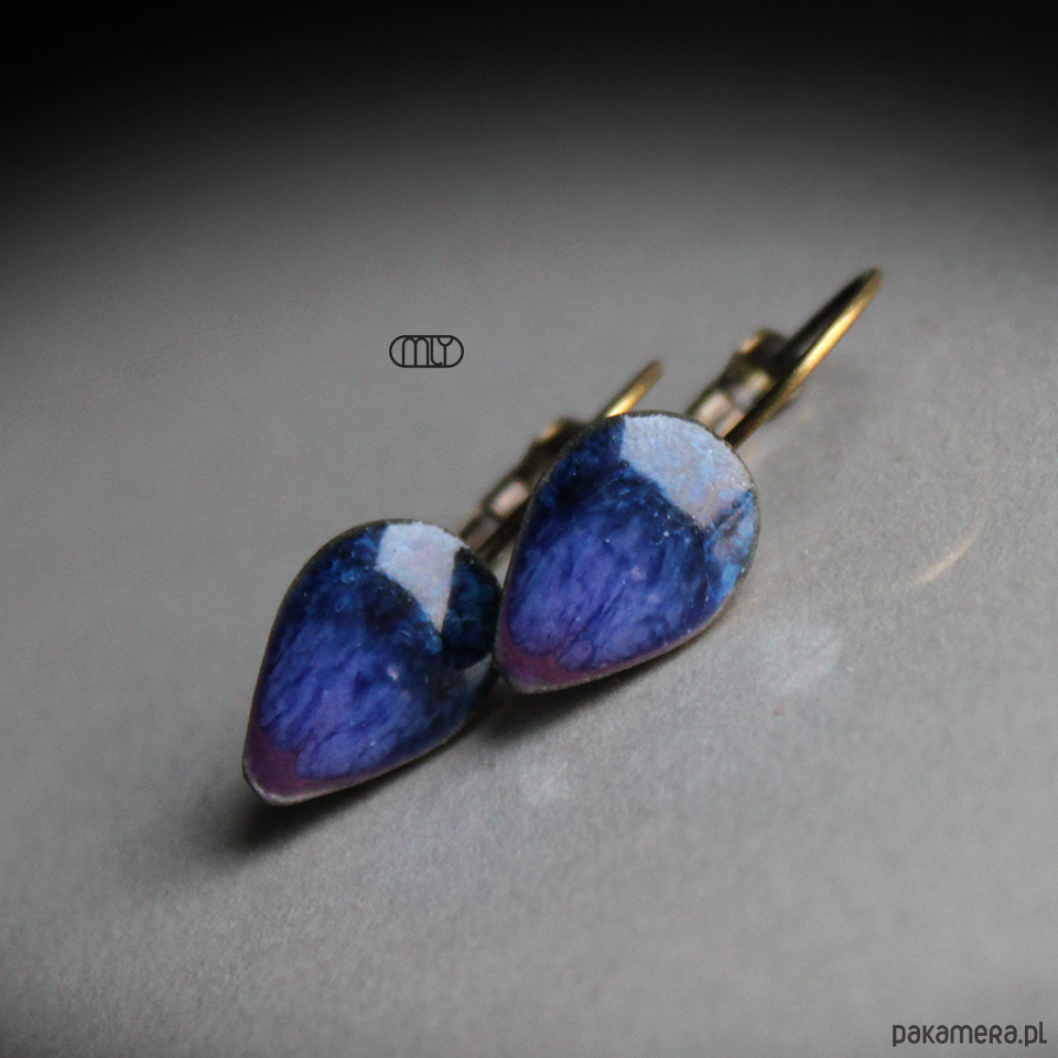 Podłużne ceramiczne kolczyki, ręcznie wykonane z delikatnej gliny kamionkowej, szkliwione mieszanką fioletowych i błękitnych szkliw z efektem plamek, na zamkniętych biglach w kolorze starego złota. Średnica elementu ceramicznego ok. 13mm, długość bigla ok 19mm. Polecam