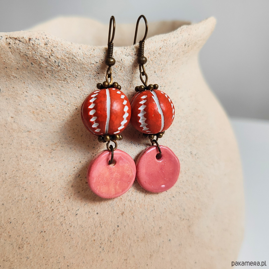Kolczyki z ceramiczną zawieszką. Elementy metalowe w kolorze mosiądzu. Okrągły koralik w kolorze cegły z białym, pastylka w kolorze brudnym różowym.