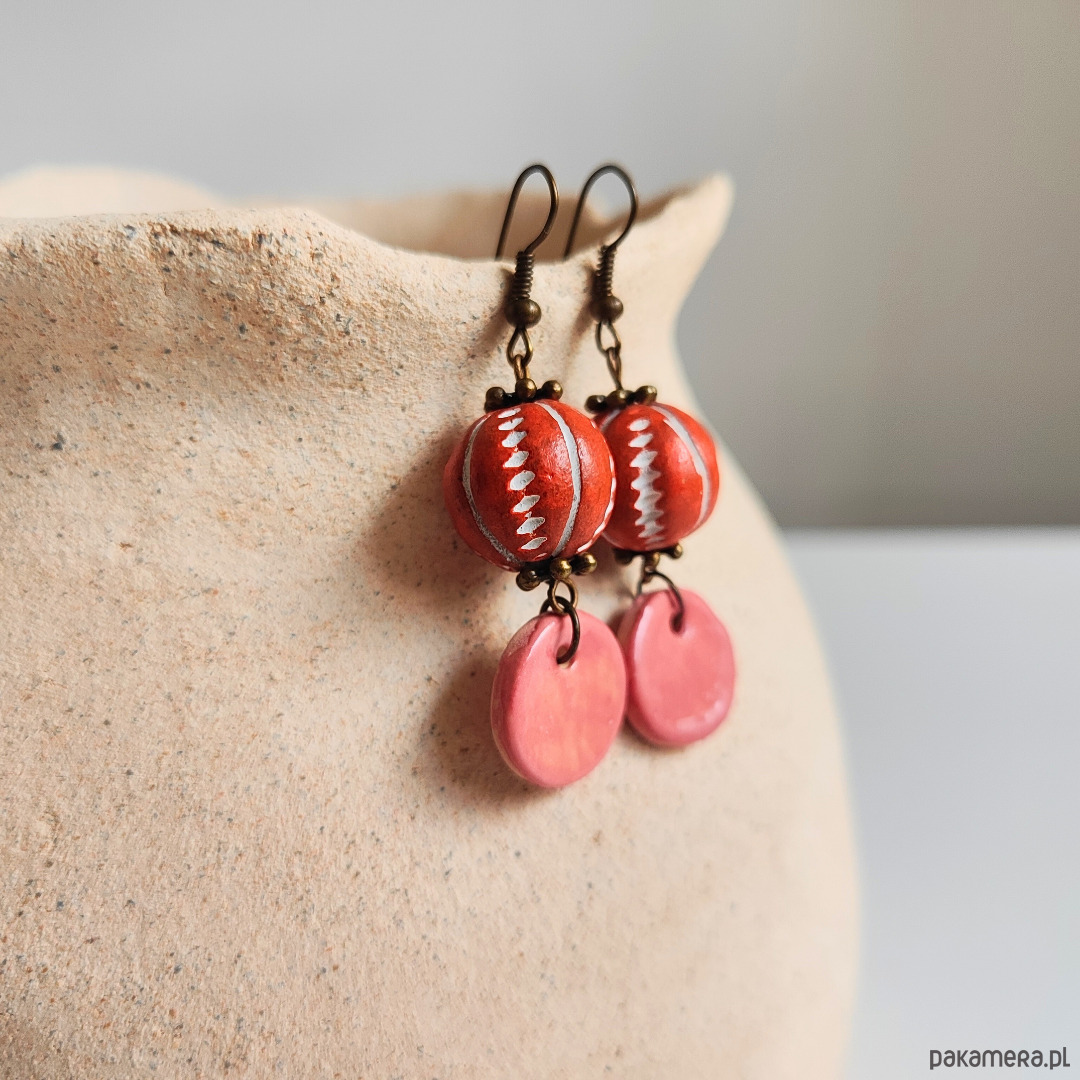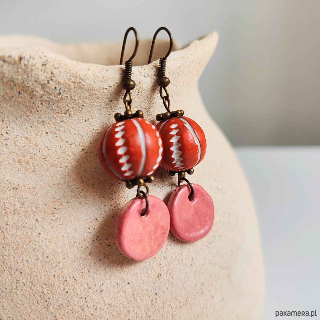 Kolczyki z ceramiczną zawieszką. Elementy metalowe w kolorze mosiądzu. Okrągły koralik w kolorze cegły z białym, pastylka w kolorze brudnym różowym.