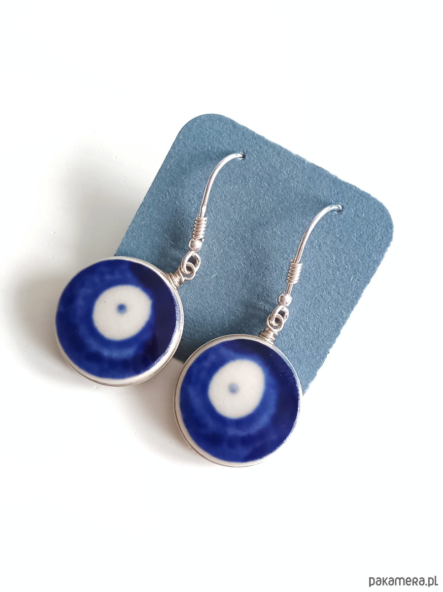 Ceramika w Bolesławcu i jego okolicach produkowana była już w XIV wieku. Do dziś najważniejszy surowiec, czyli glina wydobywany jest na miejscu, a tradycja wyrobu naczyń ceramicznych, rozwijana i kultywowana przez wieki - trwa. Bolesławiec jako marka, tworzona przez kilkadziesiąt różnych manufaktur, znana jest na całym świecie, a charakterystycznego wzoru w kobaltowe kropki nie sposób pomylić z żadnym innym. Co najbardziej wyróżnia Bolesławiec, to że szkliwo nakładane jest ręcznie, za pomocą stempelków z gąbki. Oto wiszące kolczyki, które wykonałam z fragmentów stłuczonego kubka, wykonanego właśnie w Bolesławcu (dekoracja nr 42). Wzór widoczny jest po obu stronach. Kawałki stłuczki oszlifowałam w okrągłe kształty, oprawiłam w drucik i połączyłam ze srebrnymi biglami. Brzegi pokryłam lakierem, co sprawia, że nie brudzą się i nie chłoną wilgoci. Oprawa, sztyfty oraz bigle (zapięcia) wykonane są ze srebra próby 925 - wyrób jest antyalergiczny. Średnica elementów ceramicznych: 18 mm. Waga jednego kolczyka: 3,4 g. Unikat - każdy z moich wyrobów występuje w jednym egzemplarzu. Upcykling - nie reprodukuję wykorzystywanych wzorów, niczego nie domalowuję - wykorzystuję wyłącznie oryginalne naczynia i motywy, które się na nich znajdują. Tym samym, stłuczce z odzysku nadaję nowe życie.