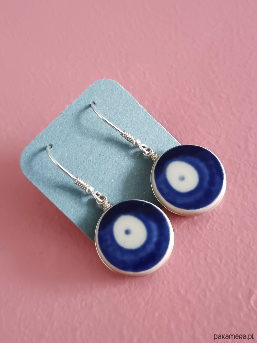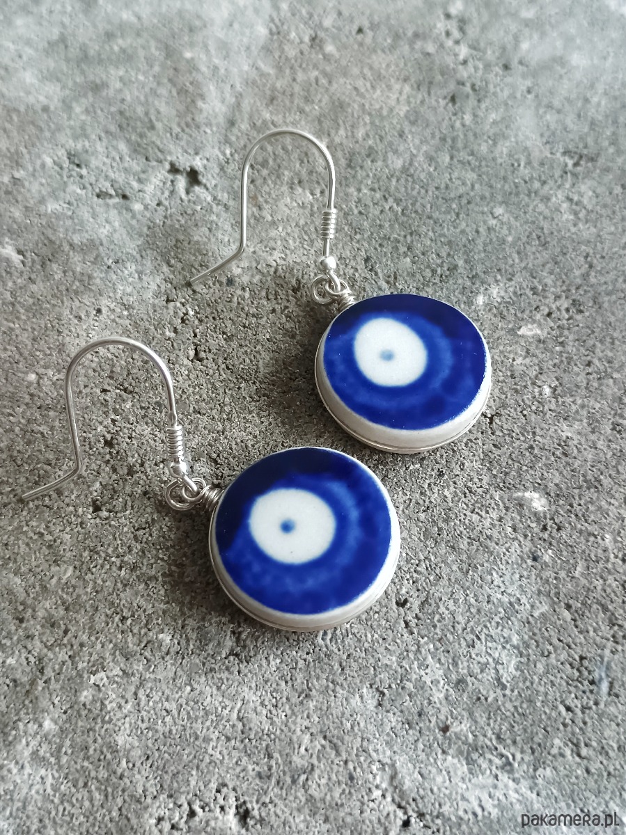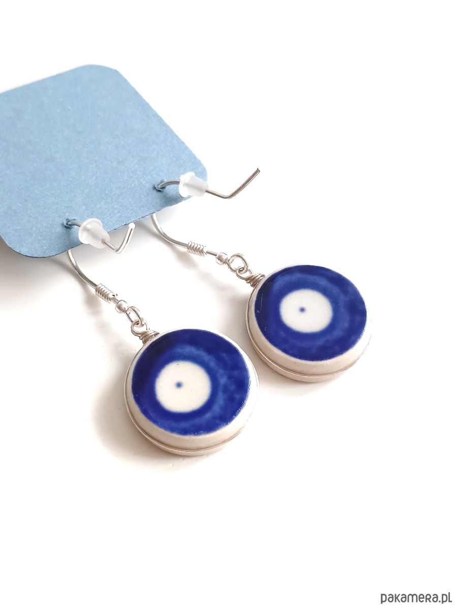 Ceramika w Bolesławcu i jego okolicach produkowana była już w XIV wieku. Do dziś najważniejszy surowiec, czyli glina wydobywany jest na miejscu, a tradycja wyrobu naczyń ceramicznych, rozwijana i kultywowana przez wieki - trwa. Bolesławiec jako marka, tworzona przez kilkadziesiąt różnych manufaktur, znana jest na całym świecie, a charakterystycznego wzoru w kobaltowe kropki nie sposób pomylić z żadnym innym. Co najbardziej wyróżnia Bolesławiec, to że szkliwo nakładane jest ręcznie, za pomocą stempelków z gąbki. Oto wiszące kolczyki, które wykonałam z fragmentów stłuczonego kubka, wykonanego właśnie w Bolesławcu (dekoracja nr 42). Wzór widoczny jest po obu stronach. Kawałki stłuczki oszlifowałam w okrągłe kształty, oprawiłam w drucik i połączyłam ze srebrnymi biglami. Brzegi pokryłam lakierem, co sprawia, że nie brudzą się i nie chłoną wilgoci. Oprawa, sztyfty oraz bigle (zapięcia) wykonane są ze srebra próby 925 - wyrób jest antyalergiczny. Średnica elementów ceramicznych: 18 mm. Waga jednego kolczyka: 3,4 g. Unikat - każdy z moich wyrobów występuje w jednym egzemplarzu. Upcykling - nie reprodukuję wykorzystywanych wzorów, niczego nie domalowuję - wykorzystuję wyłącznie oryginalne naczynia i motywy, które się na nich znajdują. Tym samym, stłuczce z odzysku nadaję nowe życie.