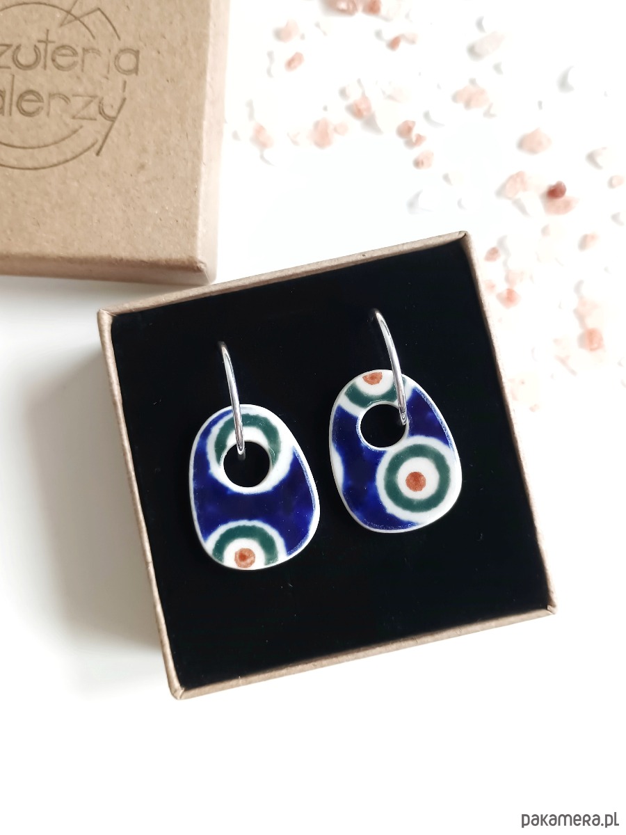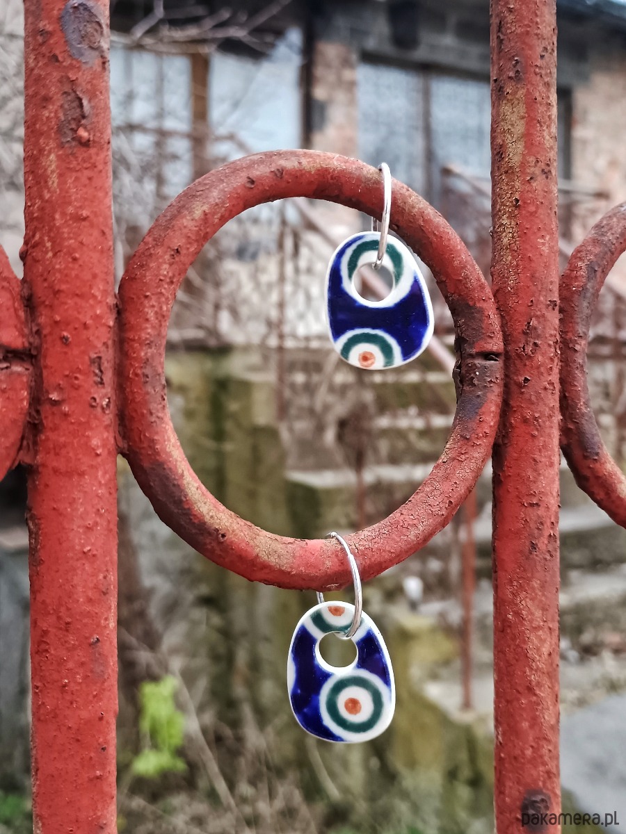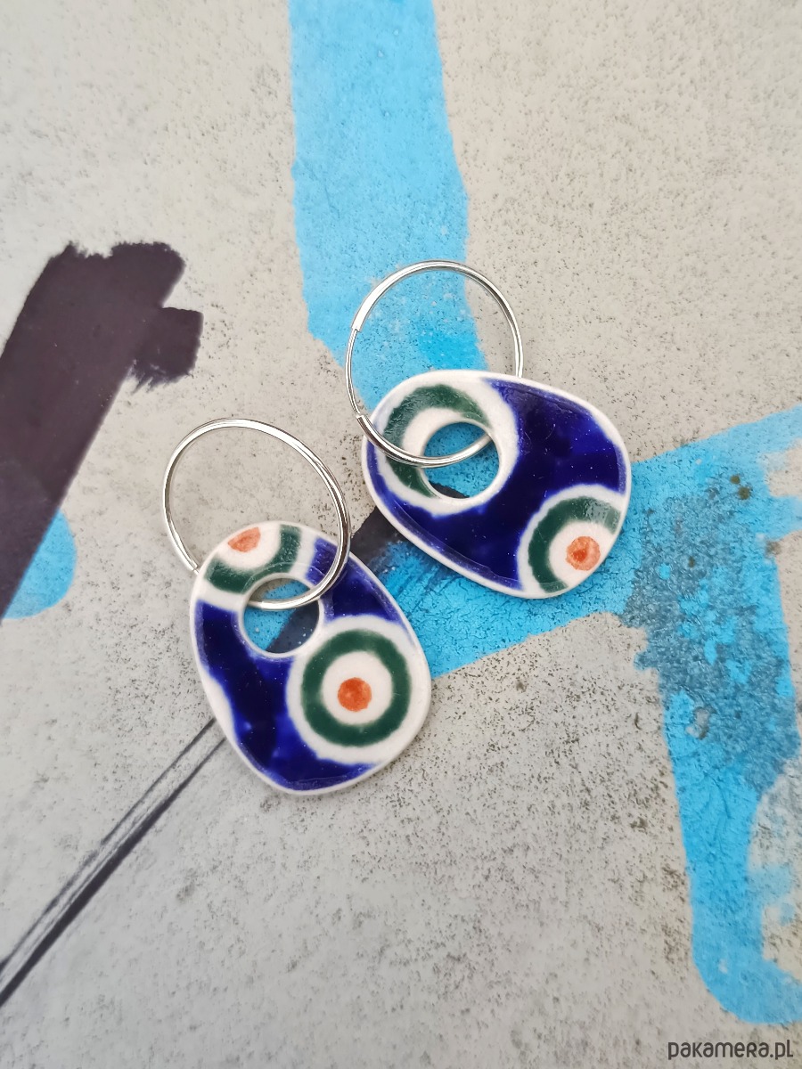 Ceramika w Bolesławcu i jego okolicach produkowana była już w XIV wieku. Do dziś najważniejszy surowiec, czyli glina wydobywany jest na miejscu, a tradycja wyrobu naczyń ceramicznych, rozwijana i kultywowana przez wieki - trwa. Bolesławiec jako marka, tworzona przez kilkadziesiąt różnych manufaktur, znana jest na całym świecie, a charakterystycznego wzoru w kobaltowe kropki nie sposób pomylić z żadnym innym. Co najbardziej wyróżnia Bolesławiec, to że szkliwo nakładane jest ręcznie, za pomocą stempelków z gąbki. Oto ażurowe wiszące kolczyki, które wykonałam z fragmentów stłuczonej miseczki z Bolesławca (dekoracja nr 8, pawie oko). Kawałki stłuczki oszlifowałam i połączyłam z okrągłymi zapięciami. Ceramikę zeszlifowałam również z grubości, żeby kolczyki nie były ciężkie. Brzegi i tył pokryłam lakierem, co sprawia, że nie brudzą się i nie chłoną wilgoci. Zapięcie, czyli koła o średnicy 19 mm wykonane są ze srebra próby 925 - wyrób jest antyalergiczny. Wymiary elementów ceramicznych: 20 x 26 mm. Waga jednego kolczyka: 2,6 g. Unikat - każdy z moich wyrobów występuje w jednym egzemplarzu. Upcykling - nie reprodukuję wykorzystywanych wzorów, niczego nie domalowuję - wykorzystuję wyłącznie oryginalne naczynia i motywy, które się na nich znajdują. Tym samym, stłuczce z odzysku nadaję nowe życie.