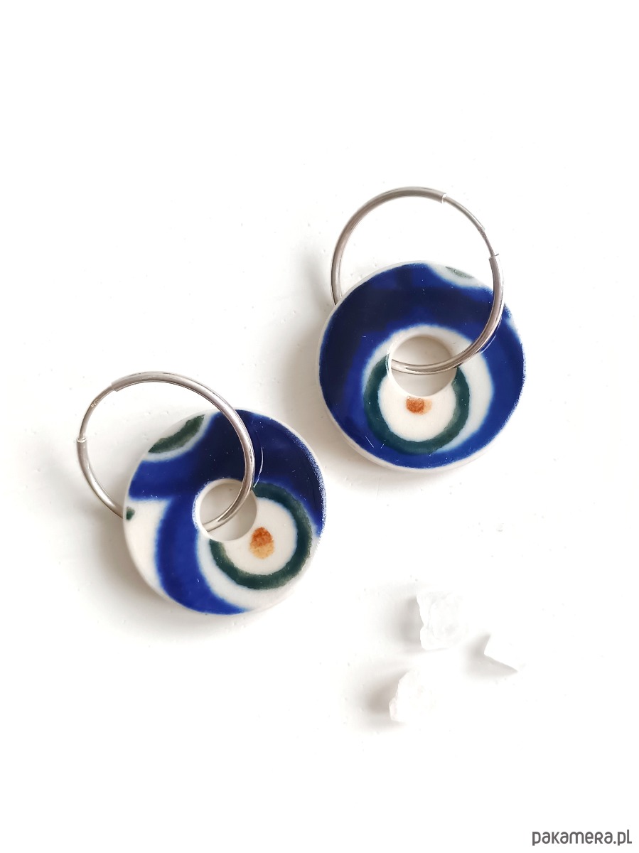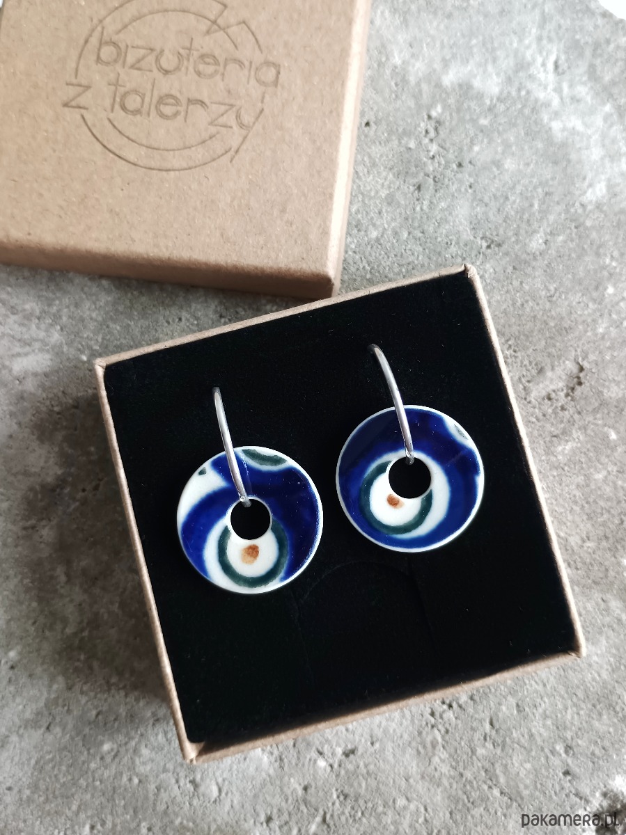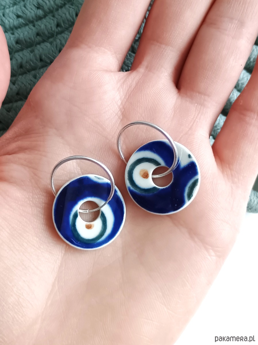 Ceramika w Bolesławcu i jego okolicach produkowana była już w XIV wieku. Do dziś najważniejszy surowiec, czyli glina wydobywany jest na miejscu, a tradycja wyrobu naczyń ceramicznych, rozwijana i kultywowana przez wieki - trwa. Bolesławiec jako marka, tworzona przez kilkadziesiąt różnych manufaktur, znana jest na całym świecie, a charakterystycznego wzoru w kobaltowe kropki nie sposób pomylić z żadnym innym. Co najbardziej wyróżnia Bolesławiec, to że szkliwo nakładane jest ręcznie, za pomocą stempelków z gąbki. Oto ażurowe wiszące kolczyki, które wykonałam z fragmentów stłuczonej miseczki z Bolesławca (dekoracja nr 8, pawie oko). Kawałki stłuczki oszlifowałam w okrągłe kształty i połączyłam z okrągłymi zapięciami. Ceramikę zeszlifowałam również z grubości, żeby kolczyki nie były ciężkie. Brzegi i tył pokryłam lakierem, co sprawia, że nie brudzą się i nie chłoną wilgoci. Zapięcie, czyli koła o średnicy 19 mm wykonane są ze srebra próby 925 - wyrób jest antyalergiczny. Średnica elementów ceramicznych: 22 mm. Waga jednego kolczyka: 2,6 g. Unikat - każdy z moich wyrobów występuje w jednym egzemplarzu. Upcykling - nie reprodukuję wykorzystywanych wzorów, niczego nie domalowuję - wykorzystuję wyłącznie oryginalne naczynia i motywy, które się na nich znajdują. Tym samym, stłuczce z odzysku nadaję nowe życie.