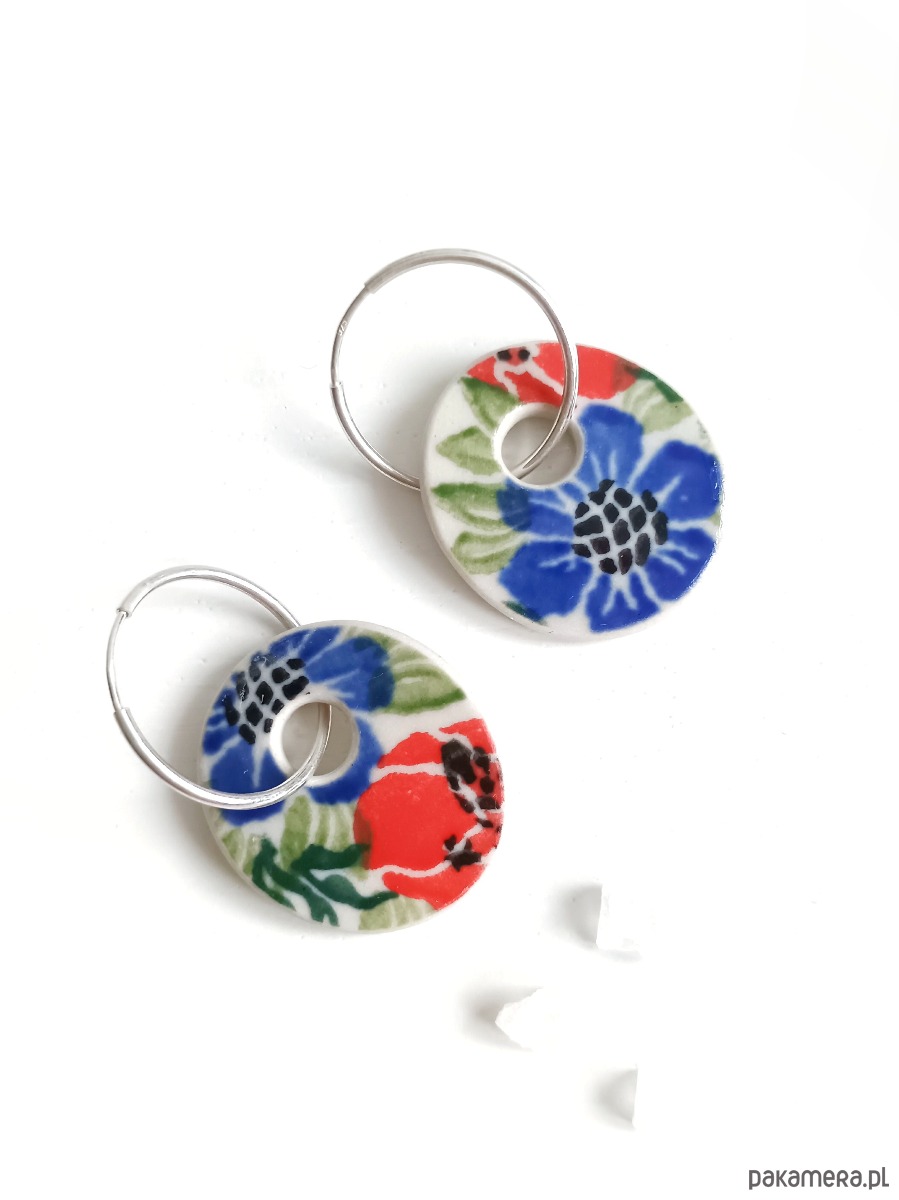 Ceramika w Bolesławcu i jego okolicach produkowana była już w XIV wieku. Do dziś najważniejszy surowiec, czyli glina wydobywany jest na miejscu, a tradycja wyrobu naczyń ceramicznych, rozwijana i kultywowana przez wieki - trwa. Bolesławiec jako marka, tworzona przez kilkadziesiąt różnych manufaktur, znana jest na całym świecie, a charakterystycznego wzoru w kobaltowe kropki nie sposób pomylić z żadnym innym. Co najbardziej wyróżnia Bolesławiec, to że szkliwo nakładane jest ręcznie, za pomocą stempelków z gąbki. Oto ażurowe wiszące kolczyki, które wykonałam z fragmentów stłuczonej miseczki z Bolesławca. Kawałki stłuczki oszlifowałam w owalne kształty i połączyłam z okrągłymi zapięciami. Ceramikę zeszlifowałam również z grubości, żeby kolczyki nie były ciężkie. Brzegi i tył pokryłam lakierem, co sprawia, że nie brudzą się i nie chłoną wilgoci. Zapięcie, czyli koła o średnicy 19 mm wykonane są ze srebra próby 925 - wyrób jest antyalergiczny. Wymiary elementów ceramicznych: 23 x 25 mm. Waga jednego kolczyka: 3,0 g. Unikat - każdy z moich wyrobów występuje w jednym egzemplarzu. Upcykling - nie reprodukuję wykorzystywanych wzorów, niczego nie domalowuję - wykorzystuję wyłącznie oryginalne naczynia i motywy, które się na nich znajdują. Tym samym, stłuczce z odzysku nadaję nowe życie.