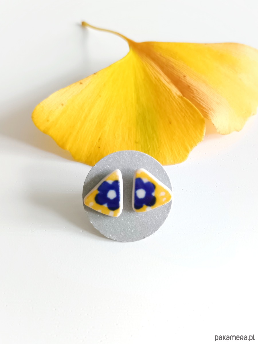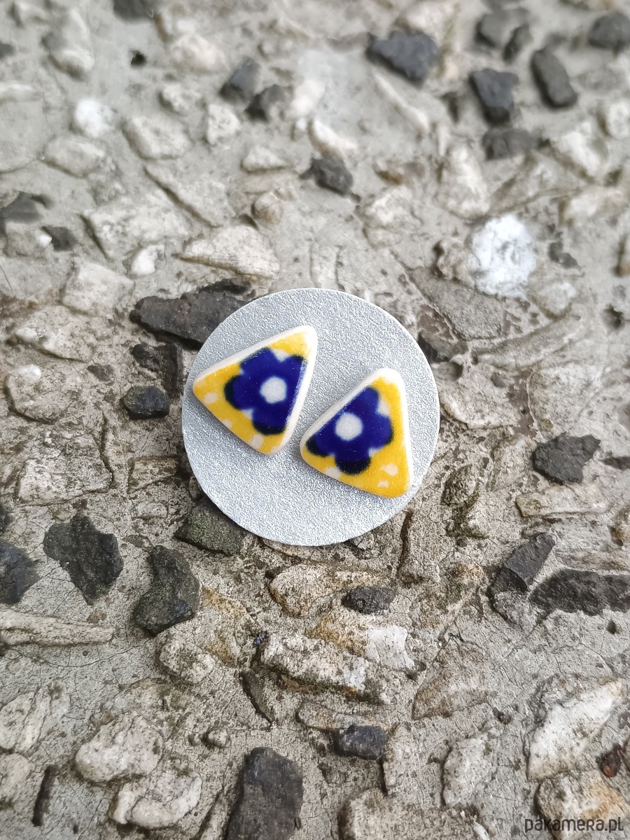 Ceramika w Bolesławcu i jego okolicach produkowana była już w XIV wieku. Do dziś najważniejszy surowiec, czyli glina wydobywany jest na miejscu, a tradycja wyrobu naczyń ceramicznych, rozwijana i kultywowana przez wieki - trwa. Bolesławiec jako marka, tworzona przez kilkadziesiąt różnych manufaktur, znana jest na całym świecie, a charakterystycznego wzoru w kobaltowe kropki nie sposób pomylić z żadnym innym. Co najbardziej wyróżnia Bolesławiec, to że szkliwo nakładane jest ręcznie, za pomocą stempelków z gąbki. Oto kolczyki, które wykonałam z fragmentów stłuczonej miseczki, wykonanej właśnie w Bolesławcu. Kawałki stłuczki oszlifowałam w trójkątne kształty i połączyłam ze srebrnymi sztyftami. Ceramikę zeszlifowałam również z grubości - jest cieńsza niż pierwotnie, dzięki czemu kolczyki nie są masywne. Brzegi pokryłam lakierem, co sprawia, że nie brudzą się i nie chłoną wilgoci. Sztyfty oraz baranki (zapięcia) wykonane są ze srebra próby 925 - wyrób jest antyalergiczny. Wymiary elementów ceramicznych: 10 x 11 mm. Unikat - każdy z moich wyrobów występuje w jednym egzemplarzu. Upcykling - nie reprodukuję wykorzystywanych wzorów, niczego nie domalowuję - wykorzystuję wyłącznie oryginalne naczynia i motywy, które się na nich znajdują. Tym samym, stłuczce z odzysku nadaję nowe życie.