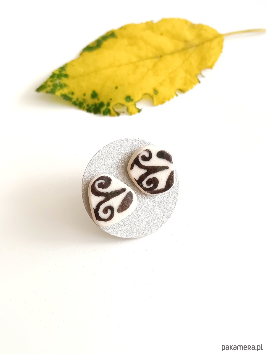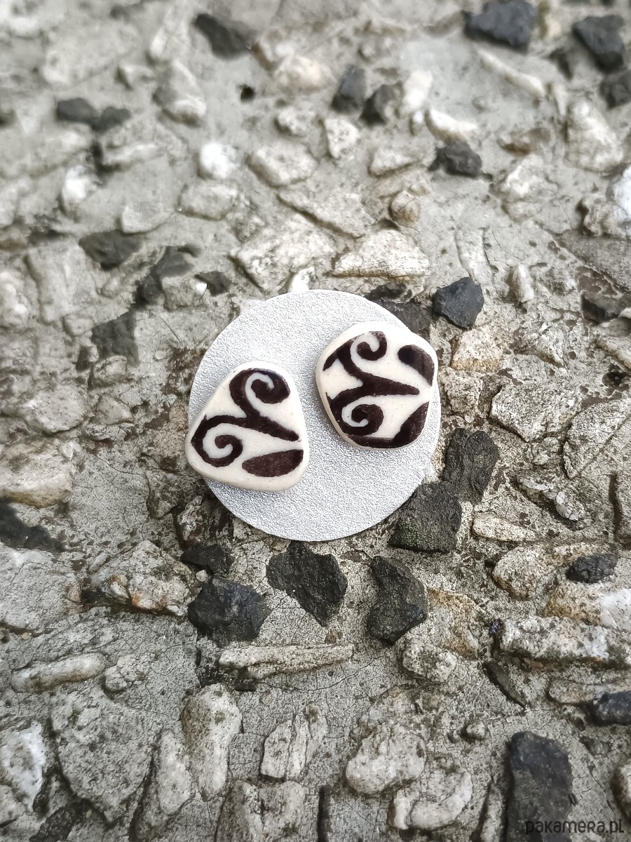 Ceramika w Bolesławcu i jego okolicach produkowana była już w XIV wieku. Do dziś najważniejszy surowiec, czyli glina wydobywany jest na miejscu, a tradycja wyrobu naczyń ceramicznych, rozwijana i kultywowana przez wieki - trwa. Bolesławiec jako marka, tworzona przez kilkadziesiąt różnych manufaktur, znana jest na całym świecie, a charakterystycznego wzoru w kobaltowe kropki nie sposób pomylić z żadnym innym. Co najbardziej wyróżnia Bolesławiec, to że szkliwo nakładane jest ręcznie, za pomocą stempelków z gąbki. Oto kolczyki, które wykonałam z fragmentów stłuczonego talerza, wykonanego właśnie w Bolesławcu. Kawałki stłuczki oszlifowałam w nieregularne kształty i połączyłam ze srebrnymi sztyftami. Ceramikę zeszlifowałam również z grubości - jest cieńsza niż pierwotnie, dzięki czemu kolczyki nie są masywne. Brzegi pokryłam lakierem, co sprawia, że nie brudzą się i nie chłoną wilgoci. Sztyfty oraz baranki (zapięcia) wykonane są ze srebra próby 925 - wyrób jest antyalergiczny. Wymiary elementów ceramicznych: 11 x 11 mm. Unikat - każdy z moich wyrobów występuje w jednym egzemplarzu. Upcykling - nie reprodukuję wykorzystywanych wzorów, niczego nie domalowuję - wykorzystuję wyłącznie oryginalne naczynia i motywy, które się na nich znajdują. Tym samym, stłuczce z odzysku nadaję nowe życie.