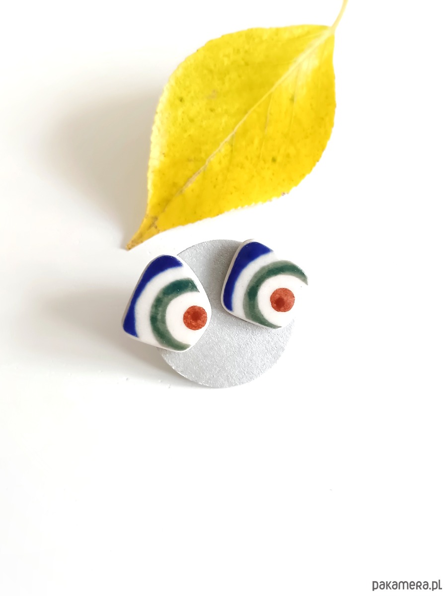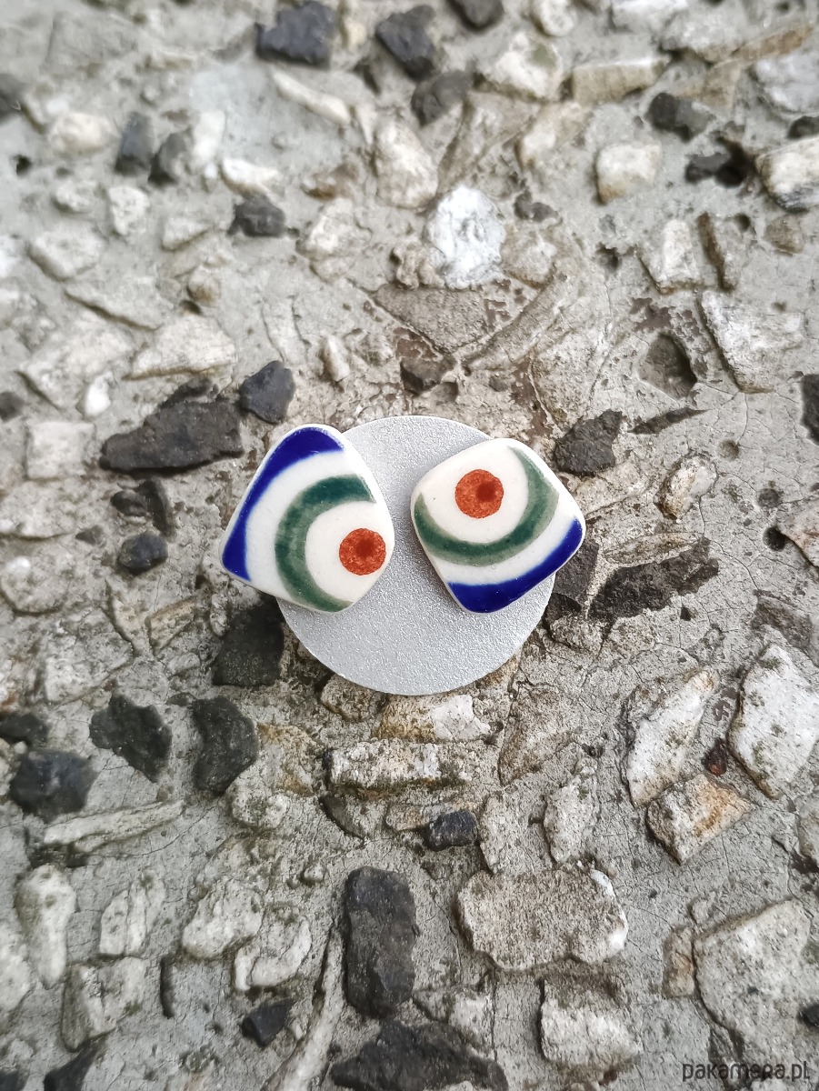 Ceramika w Bolesławcu i jego okolicach produkowana była już w XIV wieku. Do dziś najważniejszy surowiec, czyli glina wydobywany jest na miejscu, a tradycja wyrobu naczyń ceramicznych, rozwijana i kultywowana przez wieki - trwa. Bolesławiec jako marka, tworzona przez kilkadziesiąt różnych manufaktur, znana jest na całym świecie, a charakterystycznego wzoru w kobaltowe kropki nie sposób pomylić z żadnym innym. Co najbardziej wyróżnia Bolesławiec, to że szkliwo nakładane jest ręcznie, za pomocą stempelków z gąbki. Oto nieduże kolczyki, które wykonałam z fragmentów stłuczonego kubka, wykonanego właśnie w Bolesławcu (dekoracja nr 8, pawie oko). Kawałki stłuczki oszlifowałam w nieregularne kształty i połączyłam ze srebrnymi sztyftami. Ceramikę zeszlifowałam również z grubości - jest cieńsza niż pierwotnie, dzięki czemu kolczyki nie są masywne. Brzegi i tył pokryłam lakierem, co sprawia, że nie brudzą się i nie chłoną wilgoci. Sztyfty oraz baranki (zapięcia) wykonane są ze srebra próby 925 - wyrób jest antyalergiczny. Wymiary elementów ceramicznych: 12 x 12 mm. Unikat - każdy z moich wyrobów występuje w jednym egzemplarzu. Upcykling - nie reprodukuję wykorzystywanych wzorów, niczego nie domalowuję - wykorzystuję wyłącznie oryginalne naczynia i motywy, które się na nich znajdują. Tym samym, stłuczce z odzysku nadaję nowe życie.